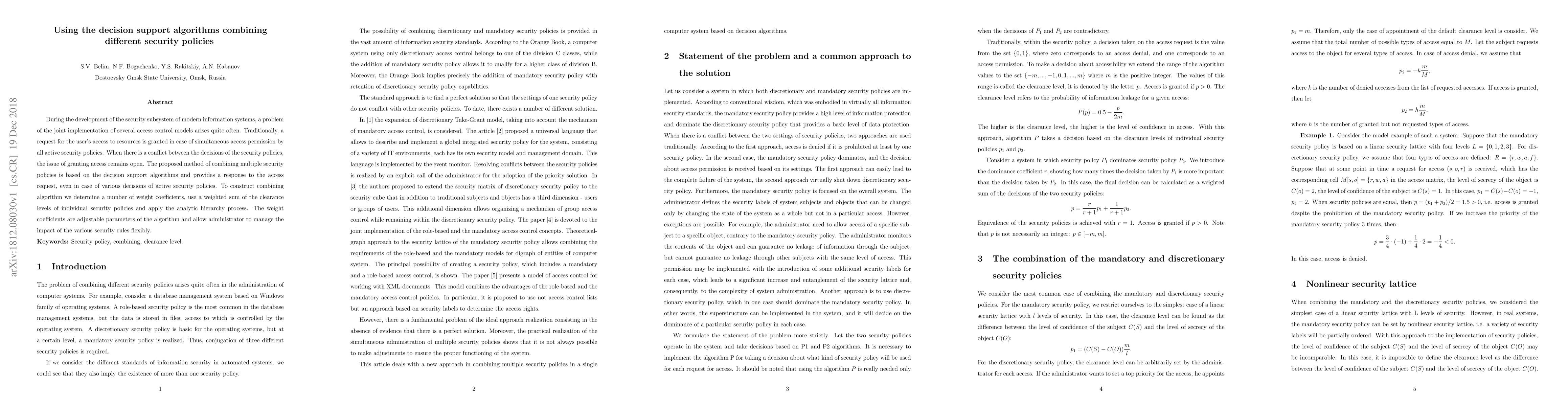 This paper proposes a method for combining multiple security policies using decision support algorithms to resolve conflicts when different policies provide conflicting access decisions. The approach employs weight coefficients and the analytic hierarchy process to create a weighted sum of clearance levels, enabling flexible management of security rules by administrators.