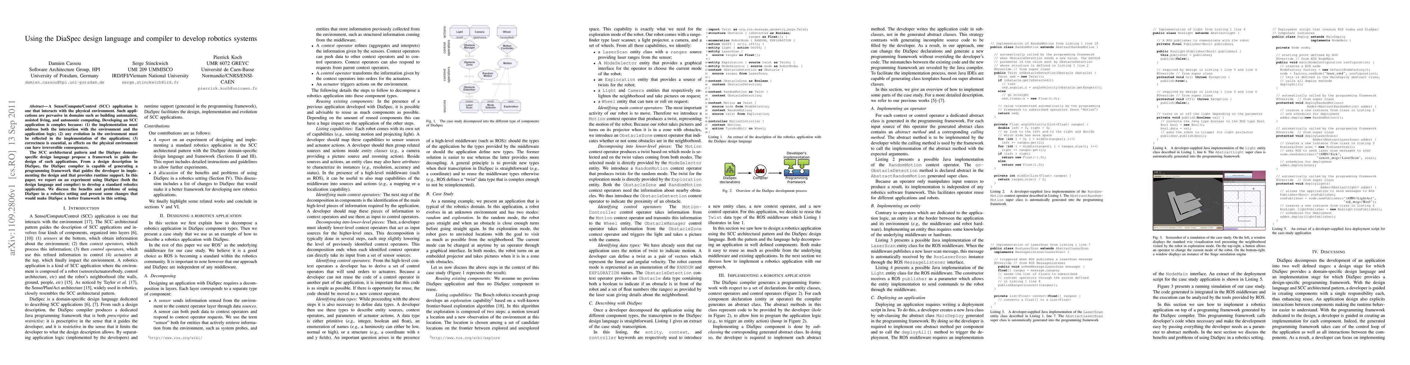 Researchers used DiaSpec to develop a robotics application, finding benefits in its design language and compiler for creating SCC applications that interact with the physical environment. The experiment highlights potential improvements needed for DiaSpec to better support robotics development.