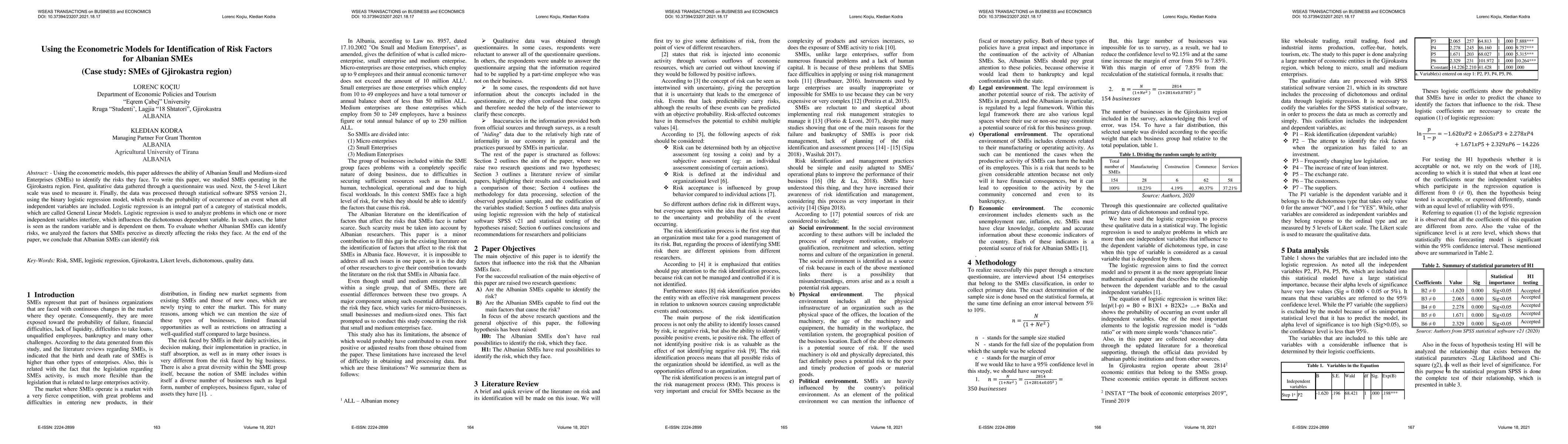 This study uses econometric models to identify risk factors for Albanian SMEs in the Gjirokastra region, finding that they can recognize risks affecting their operations. The analysis reveals specific factors that influence an SME's ability to perceive risk.