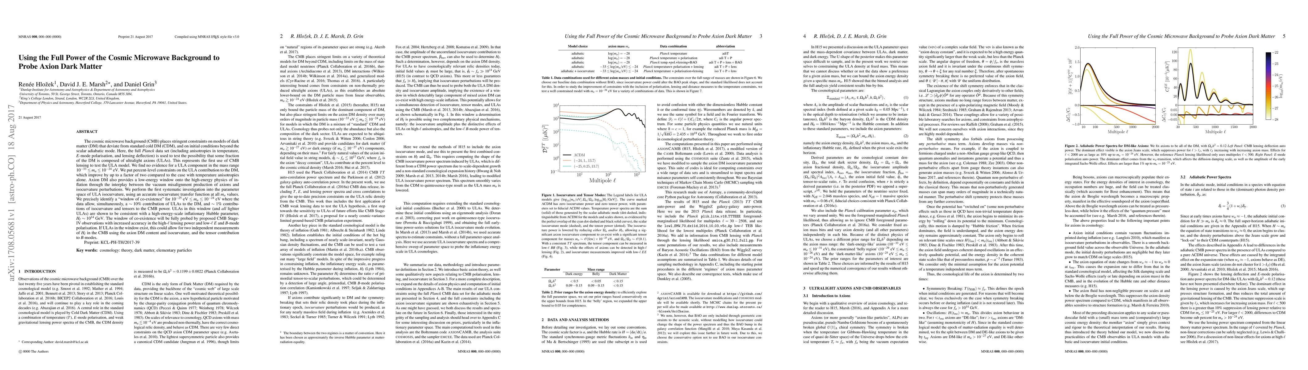 The cosmic microwave background (CMB) places strong constraints on models of dark matter (DM) that deviate from standard cold DM (CDM), and on initial conditions beyond the scalar adiabatic mode. Here, the full \textit{Planck} data set (including temperature, $E$-mode polarisation, and lensing deflection) is used to test the possibility that some fraction of the DM is composed of ultralight axions (ULAs). This represents the first use of CMB lensing to test the ULA model. We find no evidence for a ULA component in the mass range $10^{-33}\leq m_a\leq 10^{-24}\text{ eV}$. We put percent-level constraints on the ULA contribution to the DM, improving by up to a factor of two compared to the case with temperature anisotropies alone. Axion DM also provides a low-energy window onto the high-energy physics of inflation through the interplay between the vacuum misalignment production of axions and isocurvature perturbations. We perform the first systematic investigation into the parameter space of ULA isocurvature, using an accurate isocurvature transfer function at all $m_{a}$ values. We precisely identify a "window of co-existence" for $10^{-25}\text{ eV}\leq m_a\leq10^{-24}\text{ eV}$ where the data allow, simultaneously, a $\sim10\%$ contribution of ULAs to the DM, and $\sim 1\%$ contributions of isocurvature and tensors to the CMB power. ULAs in this window (and \textit{all} lighter ULAs) are shown to be consistent with a large inflationary Hubble parameter, $H_I\sim 10^{14}\text{ GeV}$. The window of co-existence will be fully probed by proposed CMB-S4 observations with increased accuracy in the high-$\ell$ lensing power and low-$\ell$ $E$ and $B$-mode polarisation. If ULAs in the window exist, this could allow for two independent measurements of $H_I$ in the CMB using the axion DM content and isocurvature, and the tensor contribution to $B$-modes.