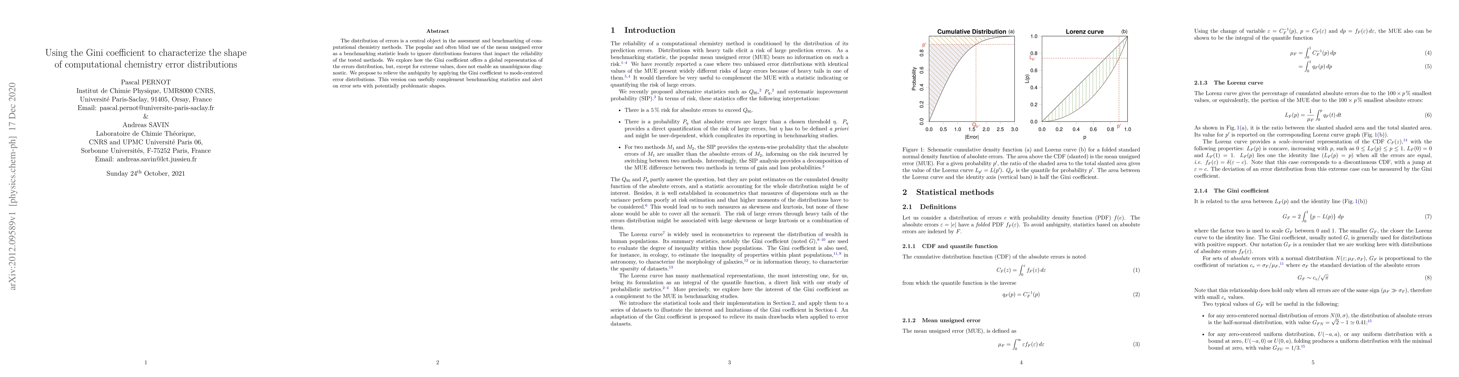 The paper investigates the use of the Gini coefficient to characterize computational chemistry error distributions, finding it useful for global representation but ambiguous without context. The authors propose applying the Gini coefficient to mode-centered error distributions to complement traditional benchmarking statistics and identify problematic error sets.