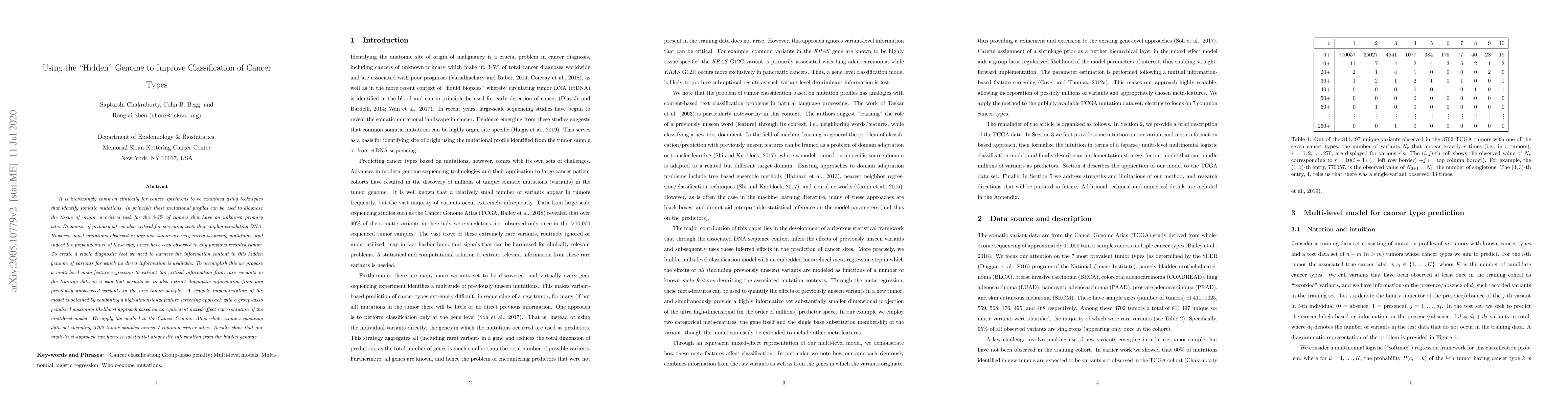 It is increasingly common clinically for cancer specimens to be examined using techniques that identify somatic mutations. In principle these mutational profiles can be used to diagnose the tissue of origin, a critical task for the 3-5% of tumors that have an unknown primary site. Diagnosis of primary site is also critical for screening tests that employ circulating DNA. However, most mutations observed in any new tumor are very rarely occurring mutations, and indeed the preponderance of these may never have been observed in any previous recorded tumor. To create a viable diagnostic tool we need to harness the information content in this "hidden genome" of variants for which no direct information is available. To accomplish this we propose a multi-level meta-feature regression to extract the critical information from rare variants in the training data in a way that permits us to also extract diagnostic information from any previously unobserved variants in the new tumor sample. A scalable implementation of the model is obtained by combining a high-dimensional feature screening approach with a group-lasso penalized maximum likelihood approach based on an equivalent mixed-effect representation of the multilevel model. We apply the method to the Cancer Genome Atlas whole-exome sequencing data set including 3702 tumor samples across 7 common cancer sites. Results show that our multi-level approach can harness substantial diagnostic information from the hidden genome.