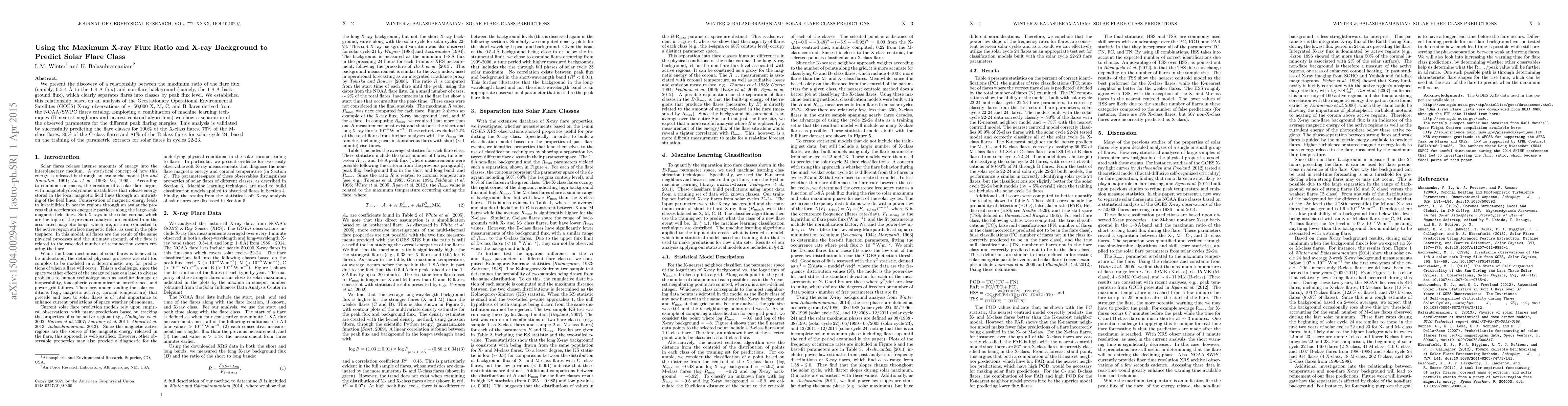 This study identifies a relationship between the maximum X-ray flux ratio and background to predict solar flare classes using GOES satellite data and machine learning techniques. The method successfully predicts X-class flares with 100% accuracy and M, C, and B classes with 76%, 80%, and 81% accuracy respectively.
