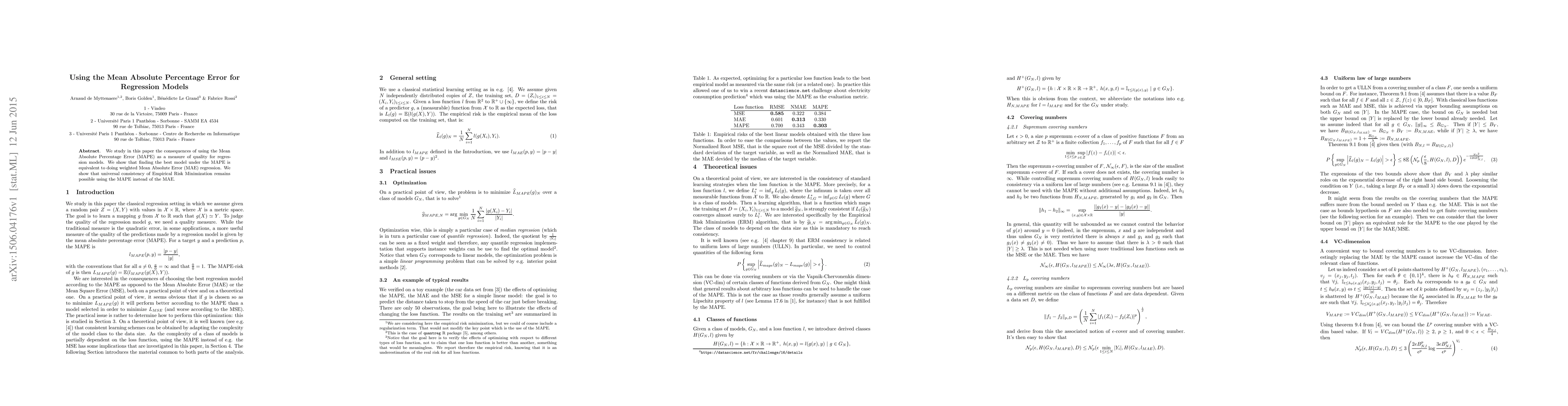 We study in this paper the consequences of using the Mean Absolute Percentage Error (MAPE) as a measure of quality for regression models. We show that finding the best model under the MAPE is equivalent to doing weighted Mean Absolute Error (MAE) regression. We show that universal consistency of Empirical Risk Minimization remains possible using the MAPE instead of the MAE.