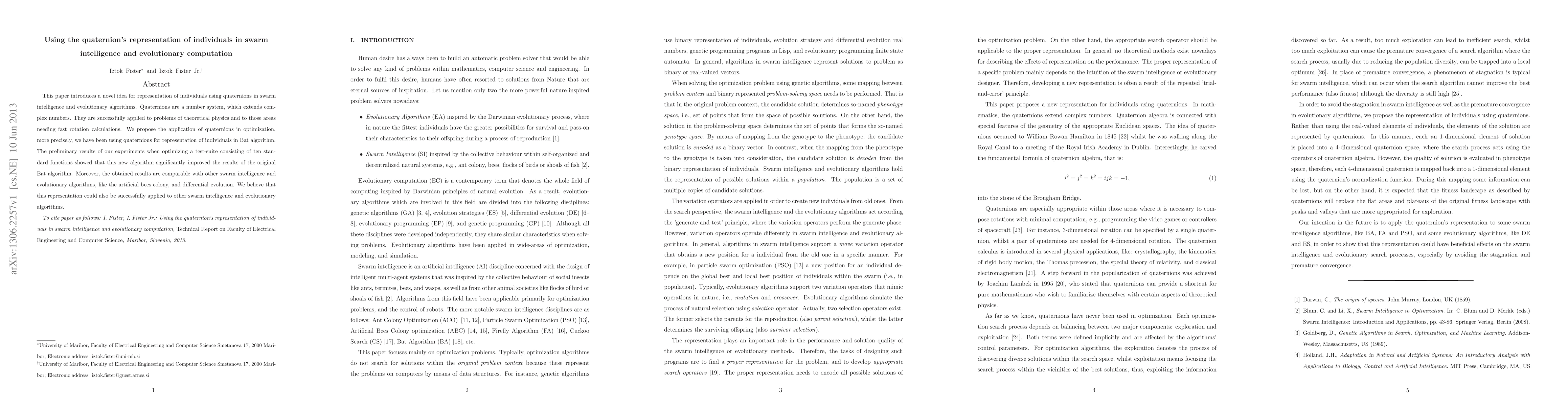 This paper proposes using quaternions to represent individuals in swarm intelligence and evolutionary algorithms, specifically within the Bat algorithm. Preliminary results show significant improvements over the original algorithm and comparable performance with other methods like the artificial bees colony and differential evolution.