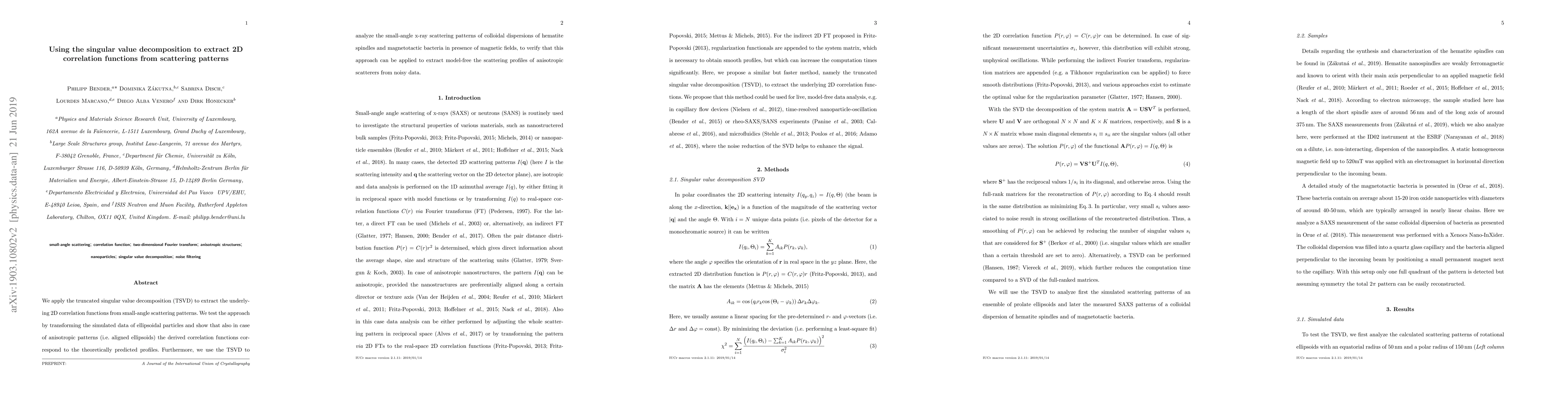 This paper utilizes truncated singular value decomposition (SVD) to extract 2D correlation functions from small-angle scattering patterns, demonstrating its effectiveness on simulated ellipsoidal particles and real colloidal dispersions of hematite spindles and magnetotactic bacteria under magnetic fields. The method successfully reveals the underlying scattering profiles of anisotropic scatterers even in noisy data.