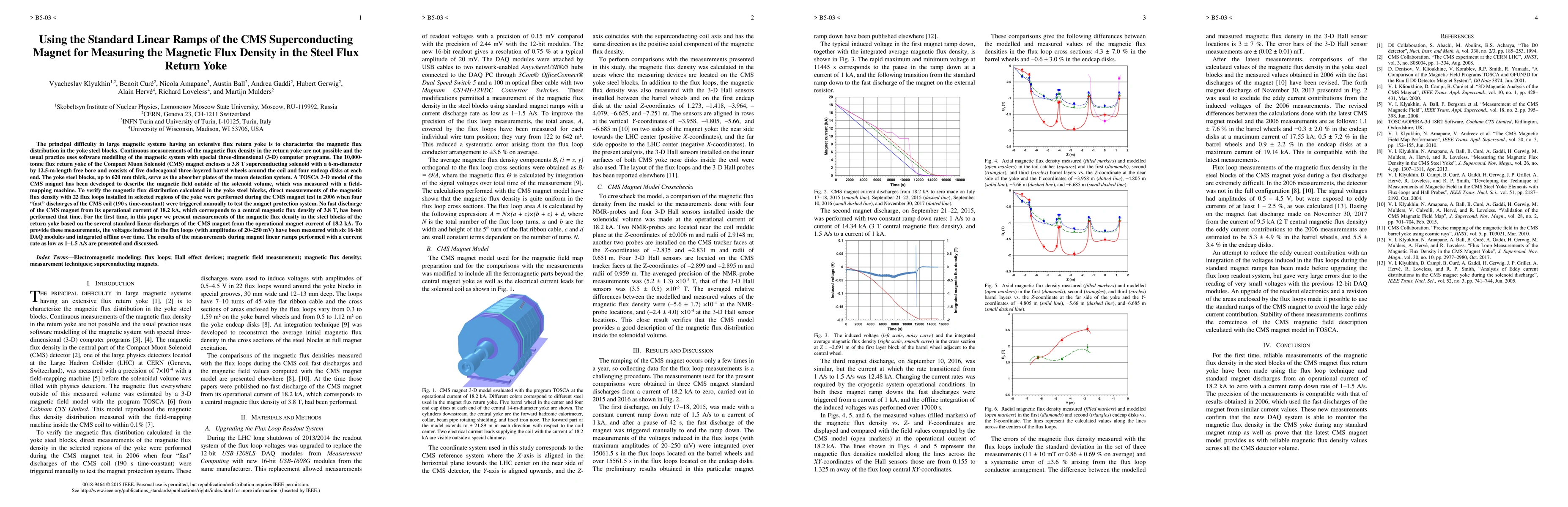 This paper presents direct measurements of magnetic flux density in the steel flux return yoke of the CMS magnet using standard linear ramps. Voltages induced in 22 flux loops were captured during magnet discharges, providing insights into the magnetic flux distribution in the yoke steel blocks.