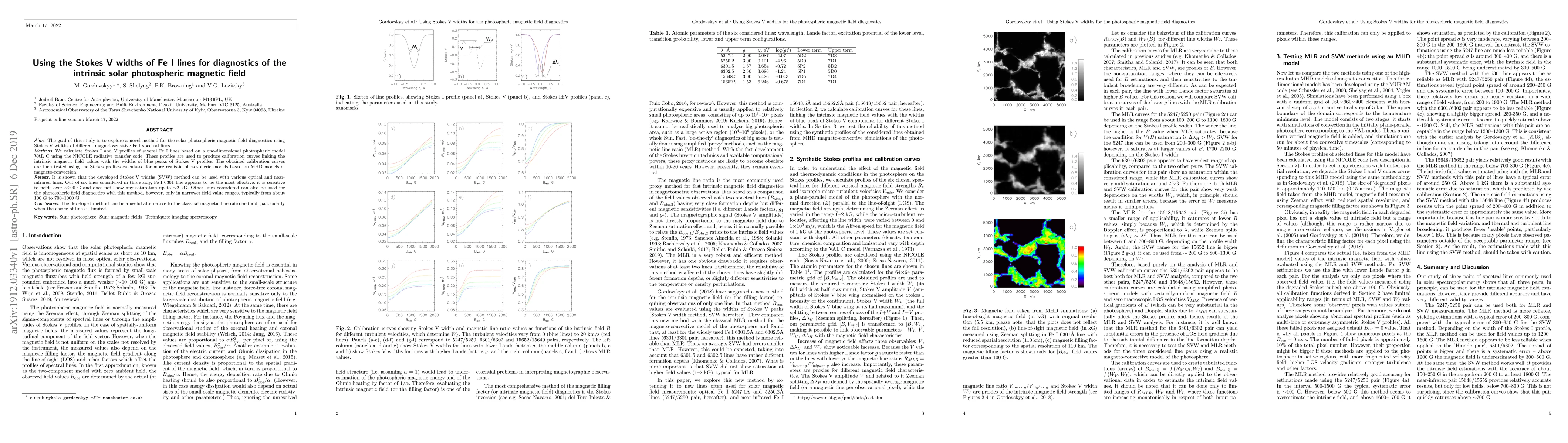 This study develops a new method for diagnosing the solar photospheric magnetic field using the Stokes V widths of Fe I lines, showing that the FeI 6301 line is particularly effective for fields up to ~2kG, offering an alternative to traditional magnetic line ratio methods. The method is tested against various photospheric models, demonstrating its potential across different spectral lines.