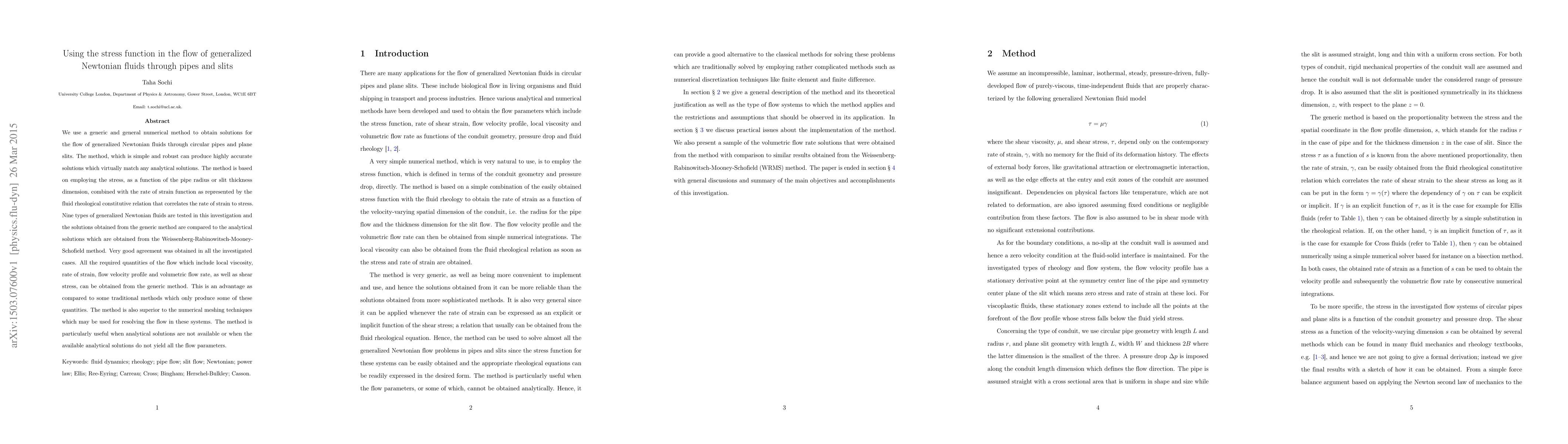 This paper presents a robust numerical method for solving the flow of generalized Newtonian fluids through pipes and slits, employing the stress function and rate of strain. The method accurately matches analytical solutions and provides comprehensive flow parameters, outperforming traditional and meshing techniques.