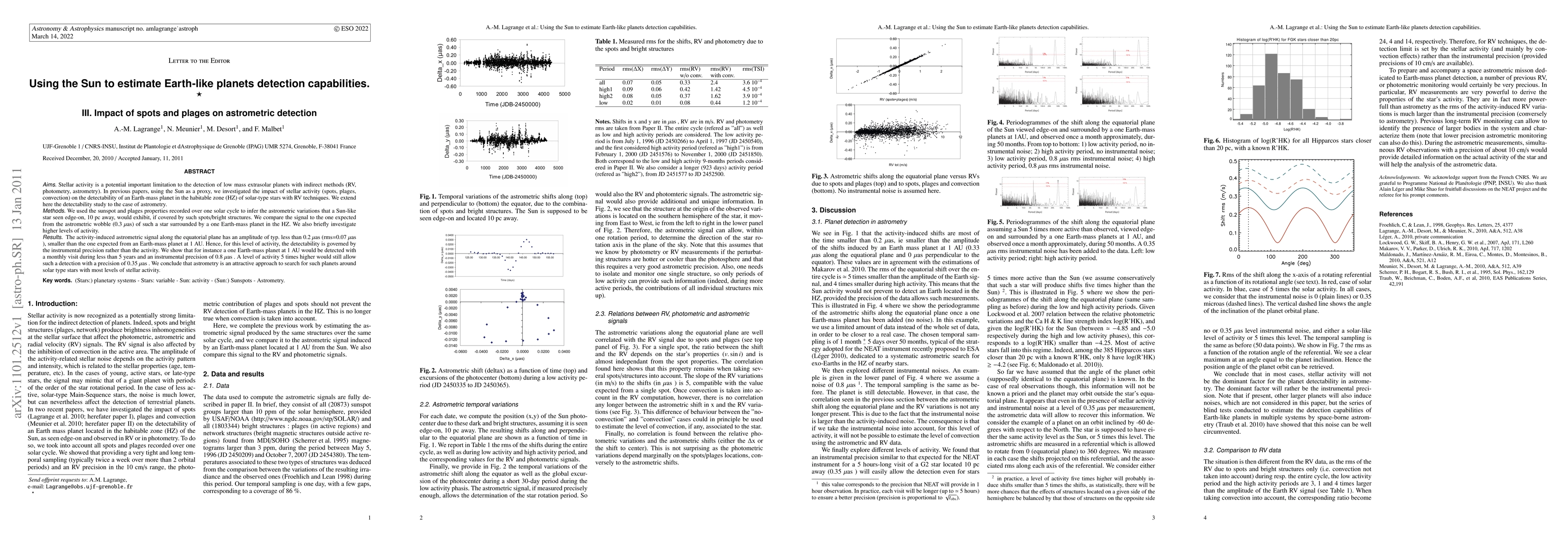 Stellar activity is a potential important limitation to the detection of low mass extrasolar planets with indirect methods (RV, photometry, astrometry). In previous papers, using the Sun as a proxy, we investigated the impact of stellar activity (spots, plages, convection) on the detectability of an Earth-mass planet in the habitable zone (HZ) of solar-type stars with RV techniques. We extend here the detectability study to the case of astrometry. We used the sunspot and plages properties recorded over one solar cycle to infer the astrometric variations that a Sun-like star seen edge-on, 10 pc away, would exhibit, if covered by such spots/bright structures. We compare the signal to the one expected from the astrometric wobble (0.3 {\mu}as) of such a star surrounded by a one Earth-mass planet in the HZ. We also briefly investigate higher levels of activity. The activity-induced astrometric signal along the equatorial plane has an amplitude of typ. less than 0.2 {\mu}as (rms=0.07 {\mu}as), smaller than the one expected from an Earth-mass planet at 1 AU. Hence, for this level of activity, the detectability is governed by the instrumental precision rather than the activity. We show that for instance a one Earth-mass planet at 1 AU would be detected with a monthly visit during less than 5 years and an instrumental precision of 0.8 {\mu}as. A level of activity 5 times higher would still allow such a detection with a precision of 0.35 {\mu}as. We conclude that astrometry is an attractive approach to search for such planets around solar type stars with most levels of stellar activity.