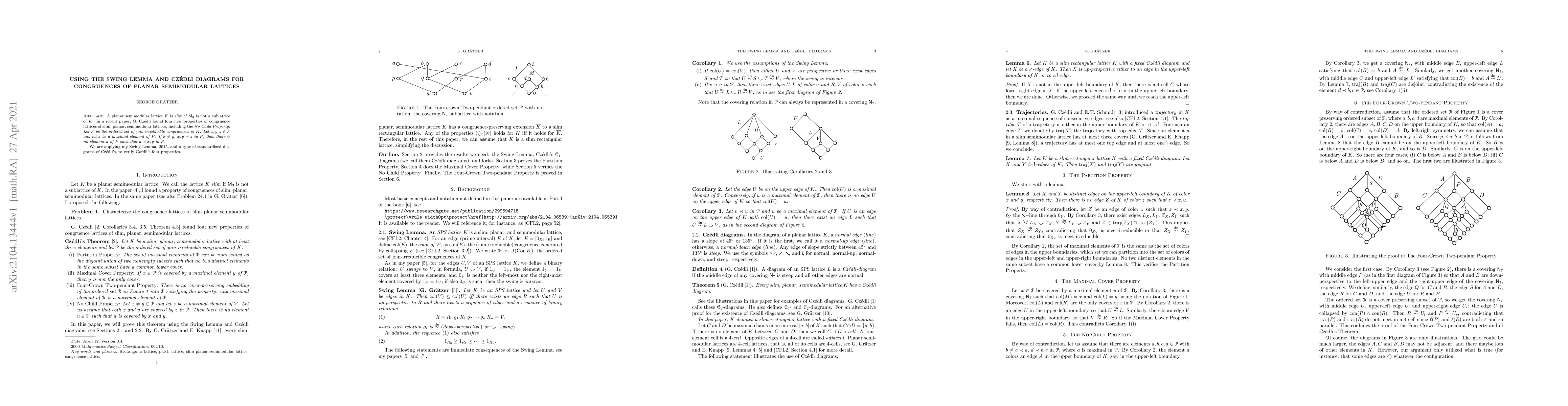 A planar semimodular lattice $K$ is \emph{slim} if $\mathsf{M}_3$ is not a sublattice of~$K$. In a recent paper, G. Cz\'edli found four new properties of congruence lattices of slim, planar, semimodular lattices, including the \emph{No Child Property}: \emph{Let~$P$ be the ordered set of join-irreducible congruences of $K$. Let $x,y,z \in P$ and let $z$ be a~maximal element of $P$. If $x \neq y$, $x, y \prec z$ in $P$, then there is no element $u$ of $P$ such that $u \prec x, y$ in $P$.} We are applying my Swing Lemma, 2015, and a type of standardized diagrams of Cz\'edli's, to verify Cz\'edli's four properties.