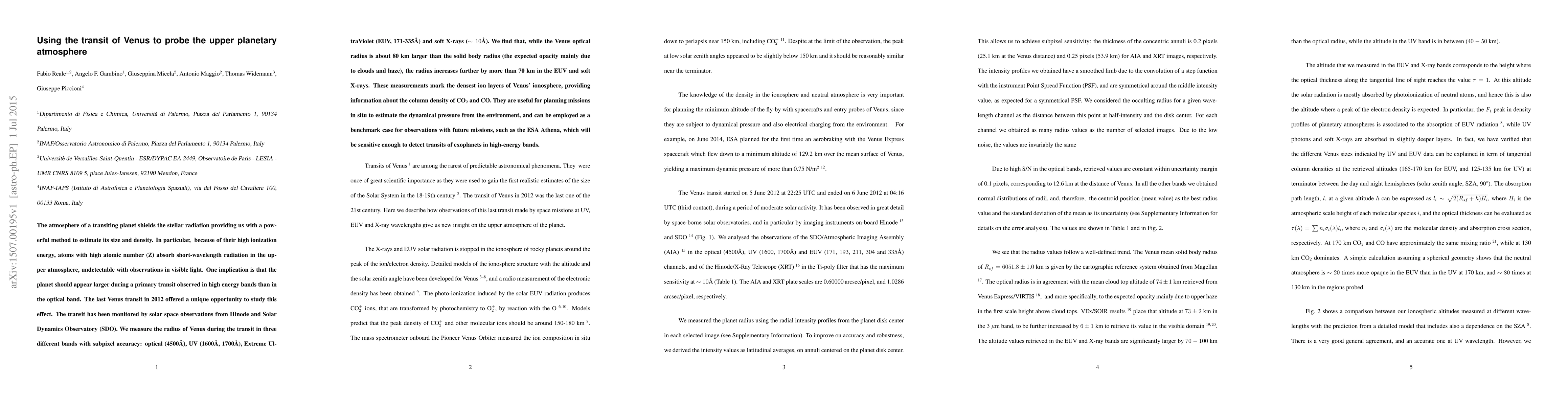 The research utilized Venus' 2012 transit to study its upper atmosphere using solar observations from Hinode and SDO. It found that Venus appeared larger in EUV and soft X-ray bands compared to optical, indicating denser ion layers. These findings provide insights into Venus' atmospheric composition and can aid in planning future space missions and exoplanet observations.