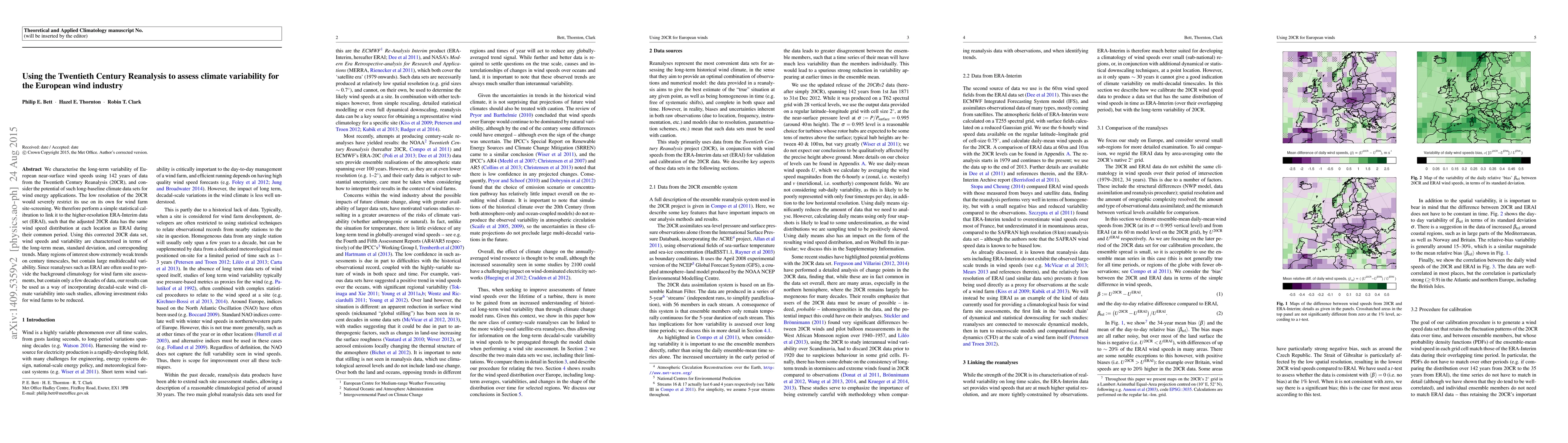 This study uses the Twentieth Century Reanalysis to characterize long-term European wind speed variability and assesses its potential for wind energy applications. A statistical calibration links the low-resolution 20CR data to the higher-resolution ERA-Interim dataset, enabling the use of century-scale climate data to inform wind farm site assessments and reduce investment risks.