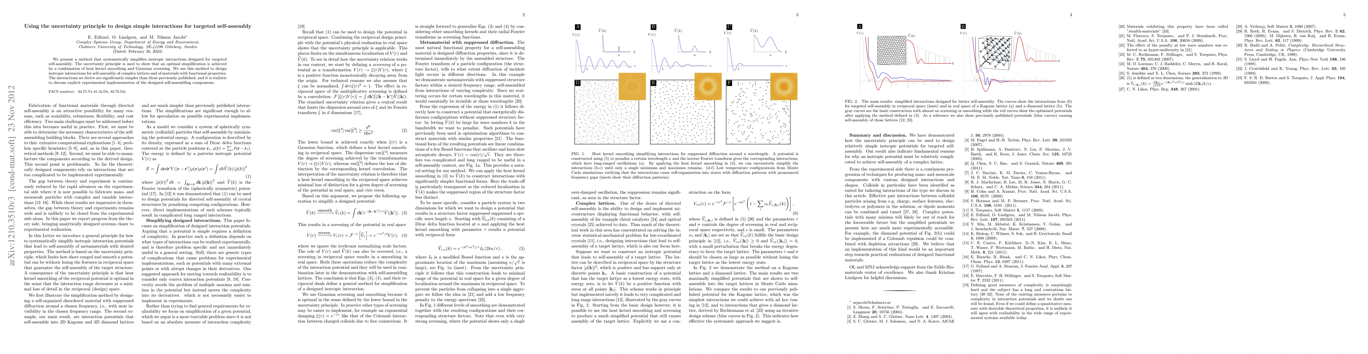 This paper proposes a method using the uncertainty principle to simplify isotropic interactions for targeted self-assembly, achieving optimal simplification through heat kernel smoothing and Gaussian screening. The derived interactions are simpler than previously published, facilitating potential experimental implementation.