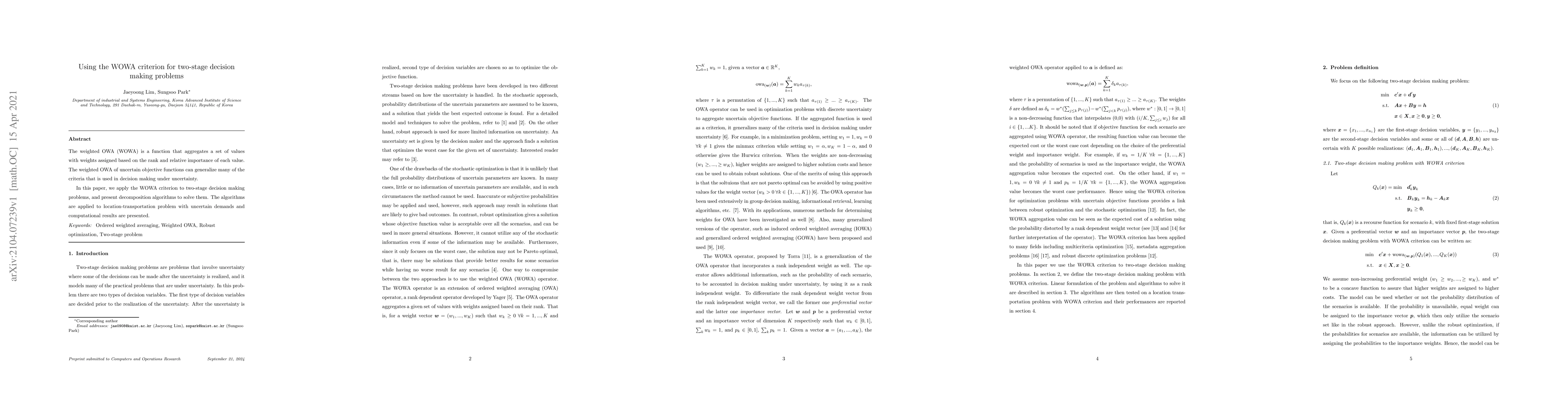The weighted OWA (WOWA) is a function that aggregates a set of values with weights assigned based on the rank and relative importance of each value. The weighted OWA of uncertain objective functions can generalize many of the criteria that is used in decision making under uncertainty. In this paper, we apply the WOWA criterion to two-stage decision making problems, and present decomposition algorithms to solve them. The algorithms are applied to location-transportation problem with uncertain demands and computational results are presented.