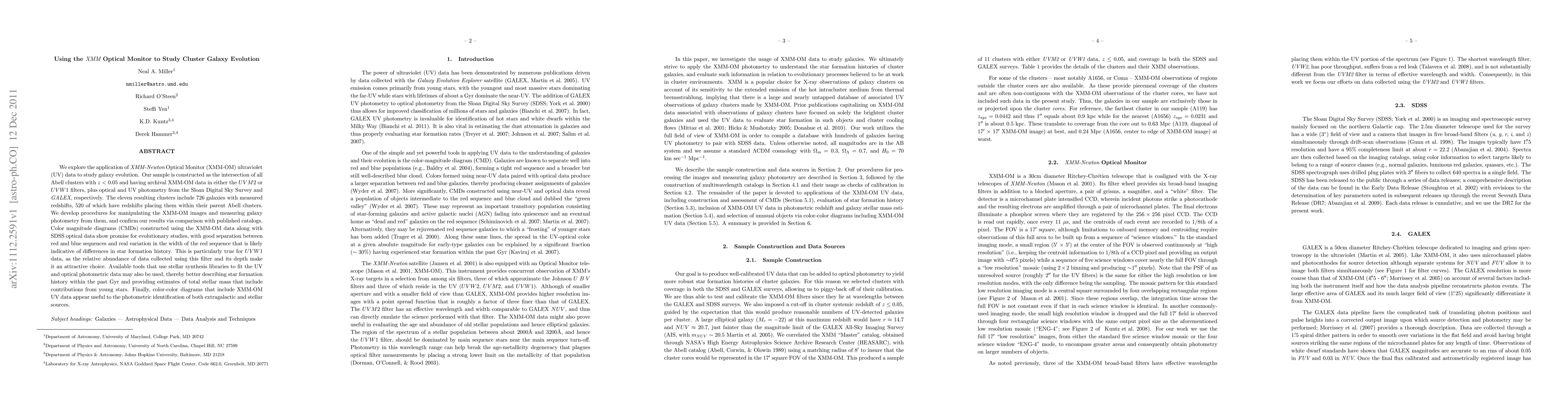 We explore the application of XMM-Newton Optical Monitor (XMM-OM) ultraviolet (UV) data to study galaxy evolution. Our sample is constructed as the intersection of all Abell clusters with z < 0.05 and having archival XMM-OM data in either the UVM2 or UVW1 filters, plus optical and UV photometry from the Sloan Digital Sky Survey and GALEX, respectively. The eleven resulting clusters include 726 galaxies with measured redshifts, 520 of which have redshifts placing them within their parent Abell clusters. We develop procedures for manipulating the XMM-OM images and measuring galaxy photometry from them, and confirm our results via comparison with published catalogs. Color magnitude diagrams (CMDs) constructed using the XMM-OM data along with SDSS optical data show promise for evolutionary studies, with good separation between red and blue sequences and real variation in the width of the red sequence that is likely indicative of differences in star formation history. This is particularly true for UVW1 data, as the relative abundance of data collected using this filter and its depth make it an attractive choice. Available tools that use stellar synthesis libraries to fit the UV and optical photometric data may also be used, thereby better describing star formation history within the past Gyr and providing estimates of total stellar mass that include contributions from young stars. Finally, color-color diagrams that include XMM-OM UV data appear useful to the photometric identification of both extragalactic and stellar sources.
