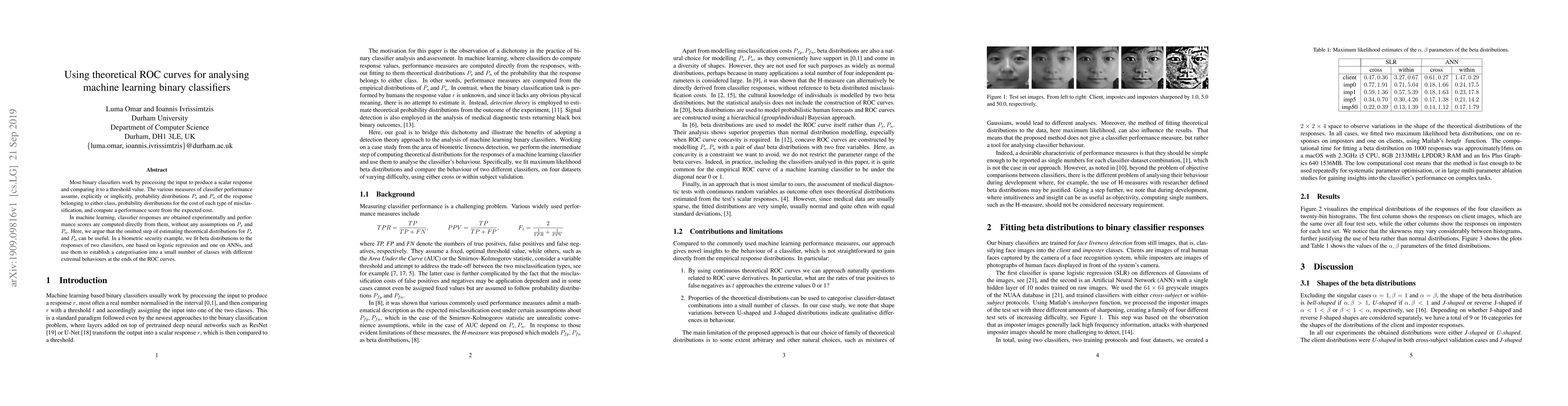 Most binary classifiers work by processing the input to produce a scalar response and comparing it to a threshold value. The various measures of classifier performance assume, explicitly or implicitly, probability distributions $P_s$ and $P_n$ of the response belonging to either class, probability distributions for the cost of each type of misclassification, and compute a performance score from the expected cost. In machine learning, classifier responses are obtained experimentally and performance scores are computed directly from them, without any assumptions on $P_s$ and $P_n$. Here, we argue that the omitted step of estimating theoretical distributions for $P_s$ and $P_n$ can be useful. In a biometric security example, we fit beta distributions to the responses of two classifiers, one based on logistic regression and one on ANNs, and use them to establish a categorisation into a small number of classes with different extremal behaviours at the ends of the ROC curves.