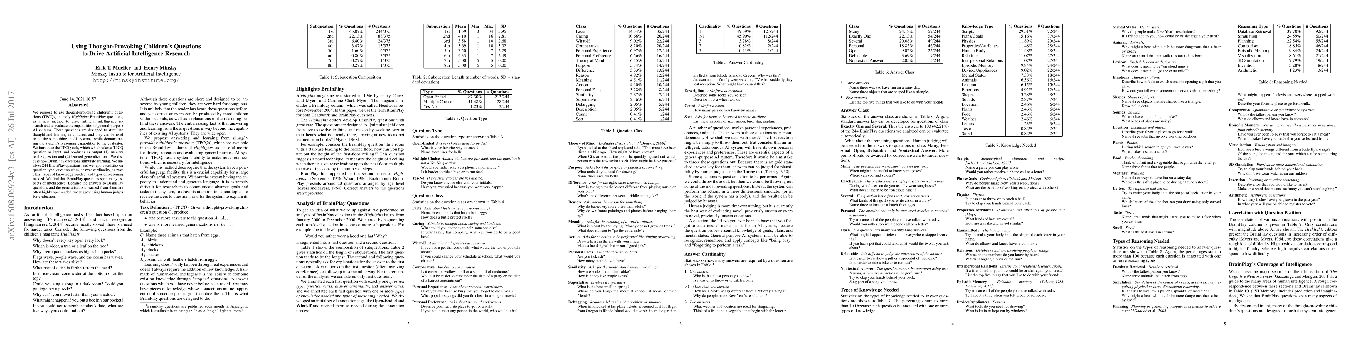 We propose to use thought-provoking children's questions (TPCQs), namely Highlights BrainPlay questions, as a new method to drive artificial intelligence research and to evaluate the capabilities of general-purpose AI systems. These questions are designed to stimulate thought and learning in children, and they can be used to do the same thing in AI systems, while demonstrating the system's reasoning capabilities to the evaluator. We introduce the TPCQ task, which which takes a TPCQ question as input and produces as output (1) answers to the question and (2) learned generalizations. We discuss how BrainPlay questions stimulate learning. We analyze 244 BrainPlay questions, and we report statistics on question type, question class, answer cardinality, answer class, types of knowledge needed, and types of reasoning needed. We find that BrainPlay questions span many aspects of intelligence. Because the answers to BrainPlay questions and the generalizations learned from them are often highly open-ended, we suggest using human judges for evaluation.