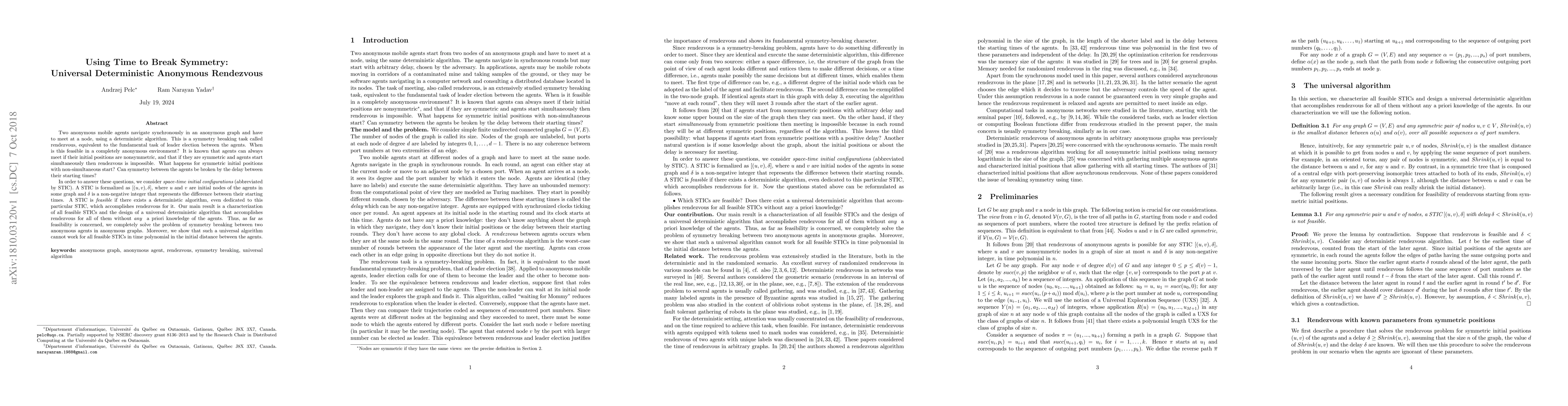 This paper investigates the feasibility of anonymous mobile agents to rendezvous in an anonymous graph, focusing on symmetry breaking when initial positions are symmetric but start times differ. The authors propose a universal deterministic algorithm that enables rendezvous for all feasible space-time initial configurations, demonstrating that a delay in starting times can break symmetry, but such an algorithm cannot operate in polynomial time relative to the initial distance between agents.