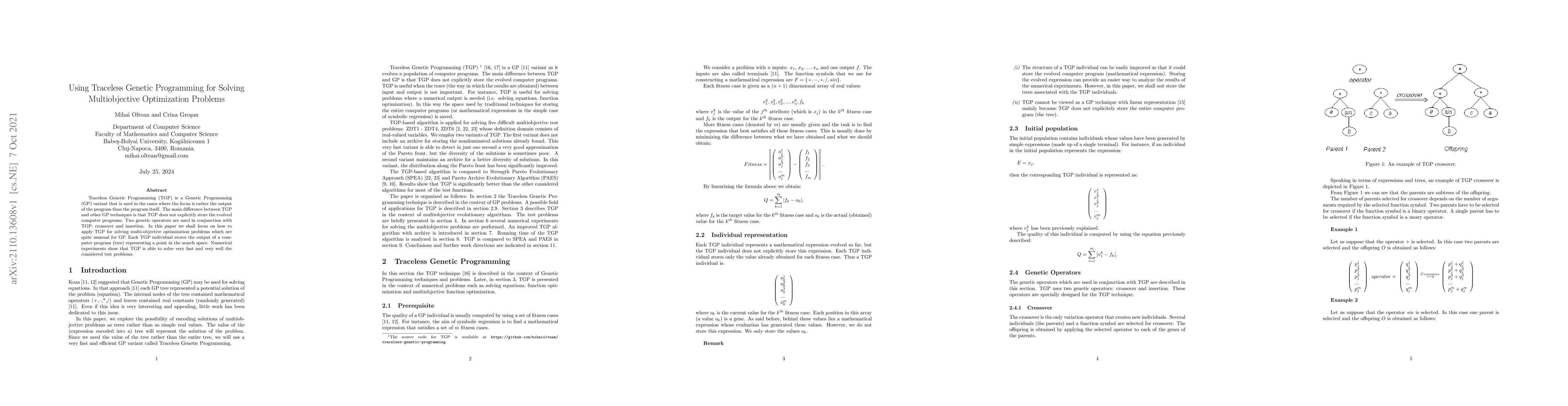 Summary: Traceless Genetic Programming (TGP) is a novel GP variant that focuses on program output rather than the program itself, solving multi-objective optimization problems efficiently without storing evolved programs. Experiments demonstrate TGP's effectiveness in quickly resolving test problems.
