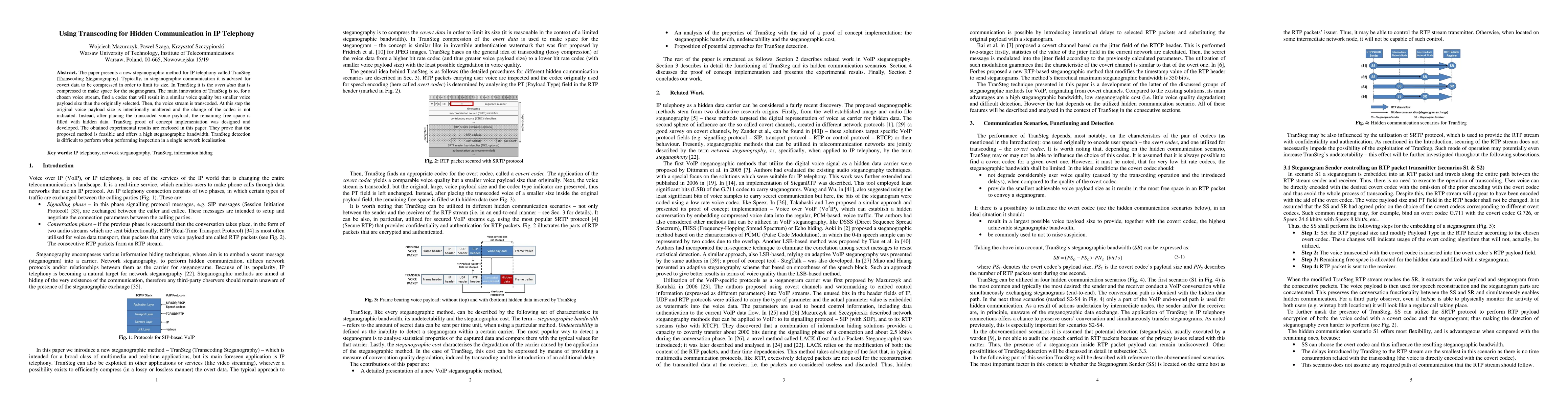 The paper introduces TranSteg, a steganographic method for IP telephony that compresses overt data to embed hidden messages, achieving a high steganographic bandwidth with minimal impact on voice quality. Experimental results demonstrate the feasibility of the method, which remains difficult to detect in local network inspections.