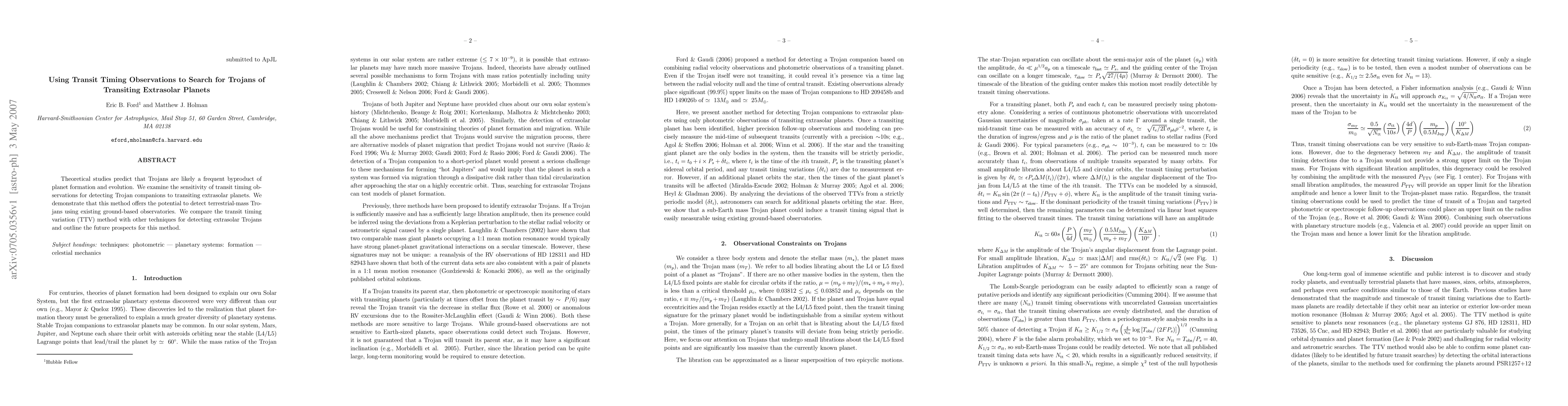 This paper explores the use of transit timing observations to detect Trojan companions of transiting extrasolar planets, demonstrating the potential for discovering terrestrial-mass Trojans with current ground-based observatories. It compares the transit timing variation method with other detection techniques and discusses future prospects for this approach.