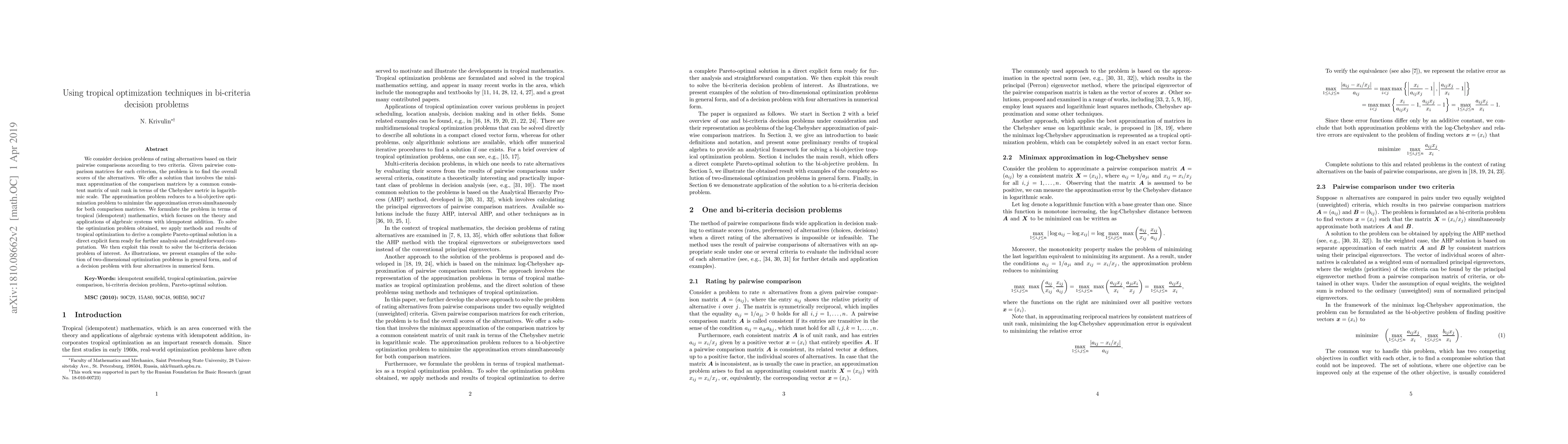 This paper proposes a tropical optimization approach to solve bi-criteria decision problems by minimizing approximation errors in pairwise comparison matrices. It derives a complete Pareto-optimal solution using tropical mathematics and applies it to illustrate decision problems with multiple alternatives.