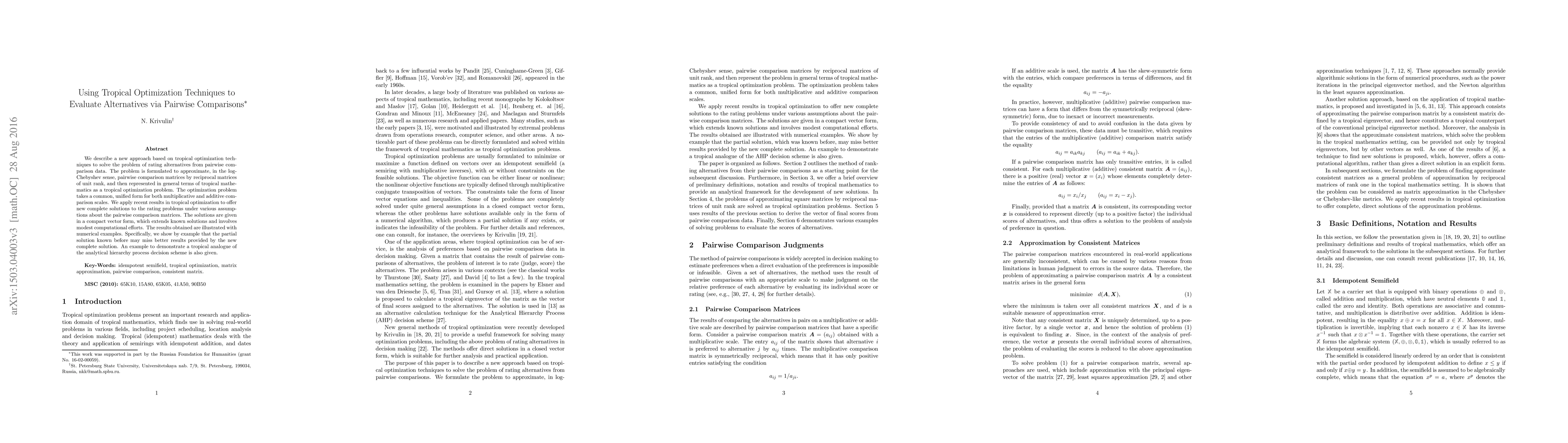 This paper introduces a tropical optimization technique for evaluating alternatives using pairwise comparison data, providing a unified approach for both multiplicative and additive scales. The new method offers complete solutions in compact vector form, demonstrating improved results over previous partial solutions through numerical examples.
