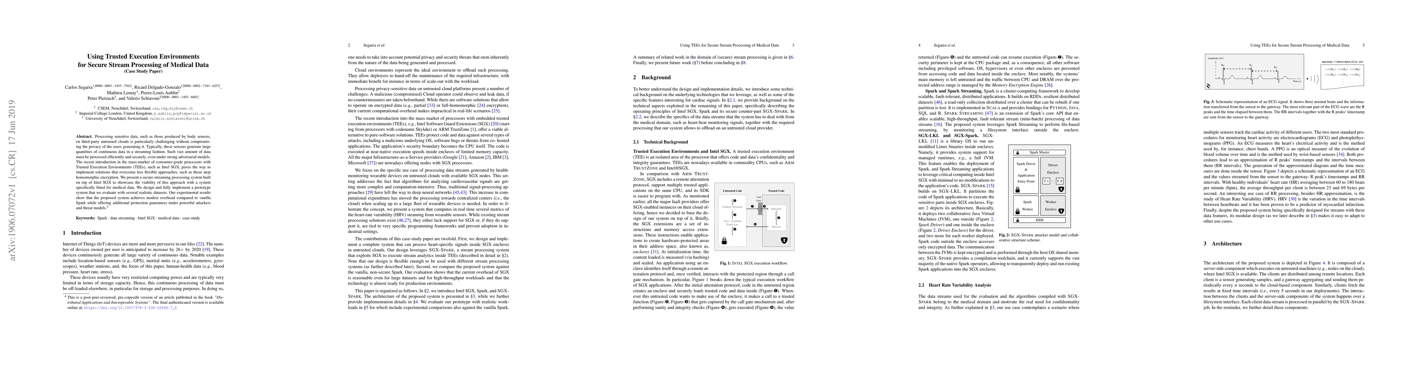 Processing sensitive data, such as those produced by body sensors, on third-party untrusted clouds is particularly challenging without compromising the privacy of the users generating it. Typically, these sensors generate large quantities of continuous data in a streaming fashion. Such vast amount of data must be processed efficiently and securely, even under strong adversarial models. The recent introduction in the mass-market of consumer-grade processors with Trusted Execution Environments (TEEs), such as Intel SGX, paves the way to implement solutions that overcome less flexible approaches, such as those atop homomorphic encryption. We present a secure streaming processing system built on top of Intel SGX to showcase the viability of this approach with a system specifically fitted for medical data. We design and fully implement a prototype system that we evaluate with several realistic datasets. Our experimental results show that the proposed system achieves modest overhead compared to vanilla Spark while offering additional protection guarantees under powerful attackers and threat models.