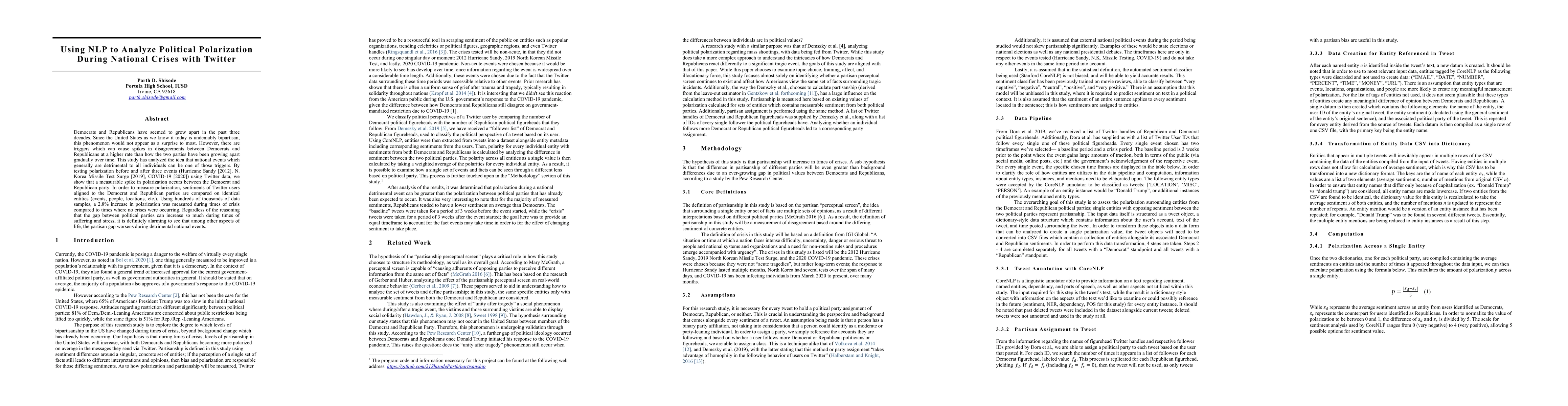 This study analyzes Twitter data to measure the spike in political polarization between Democrats and Republicans during national crises, finding a 2.8% increase during events like Hurricane Sandy, North Korea Missile Tests, and COVID-19. The research highlights how national crises exacerbate partisan divides, revealing a troubling trend in political relations.