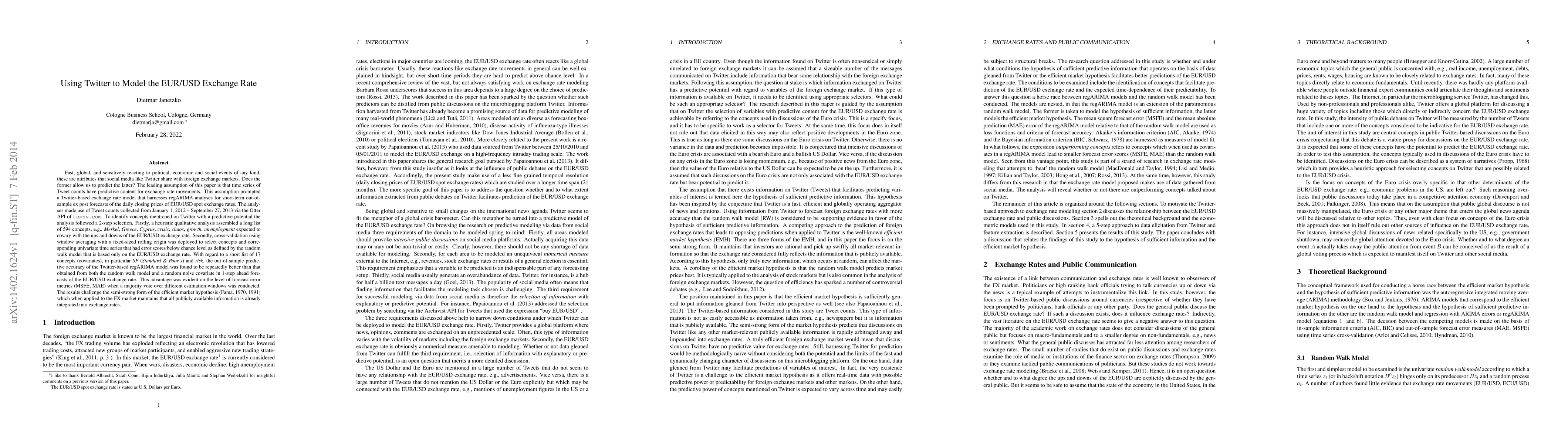A study found that Twitter data can predict EUR/USD exchange rates with higher accuracy than traditional methods like random walks, challenging the efficient market hypothesis. The research used a Twitter-based model to forecast exchange rates using regARIMA analyses.