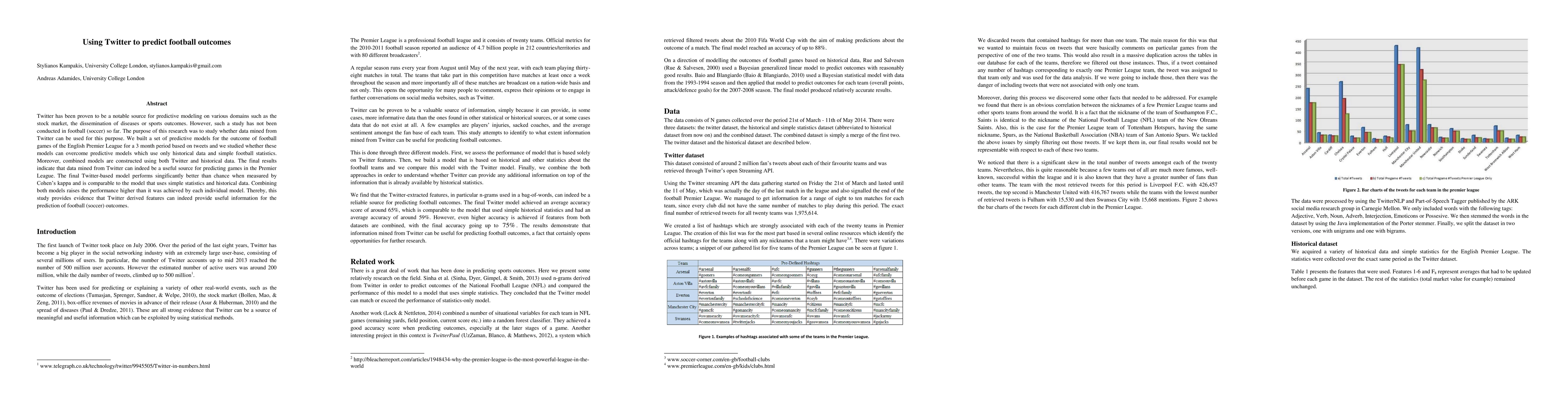 This research investigates the potential of Twitter data to predict outcomes of English Premier League football matches, finding that Twitter-based models outperform random chance and are comparable to models using historical data and statistics. Combining Twitter data with traditional methods further enhances predictive performance.