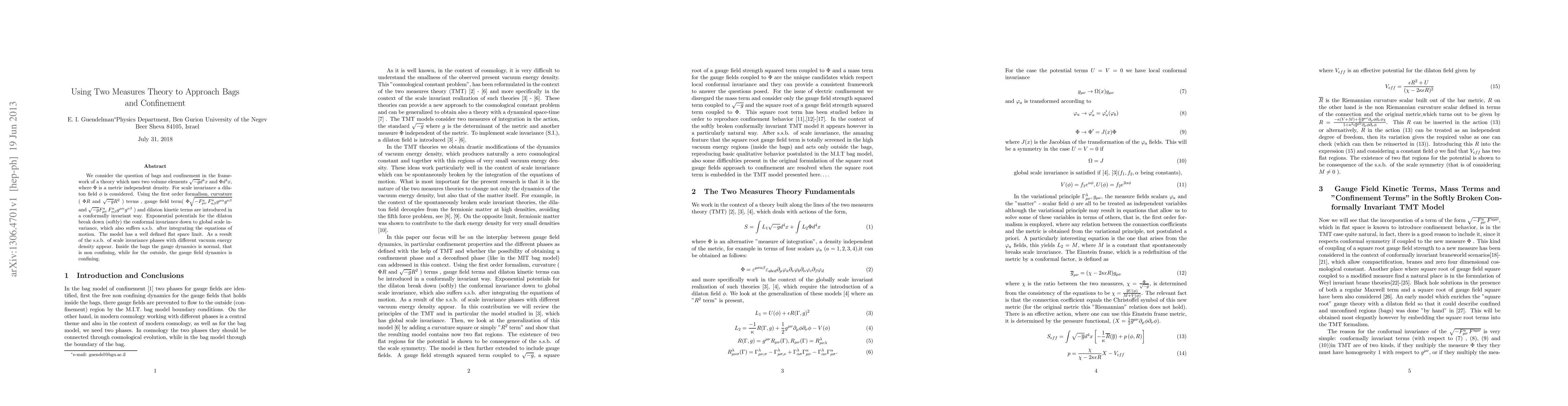 This paper explores a theoretical framework using two volume elements to study bags and confinement, introducing curvature and gauge field terms in a conformally invariant manner. The model breaks conformal invariance to global scale invariance, leading to phases with different vacuum energies and a non-confining gauge dynamics inside "bags" versus confining dynamics outside.