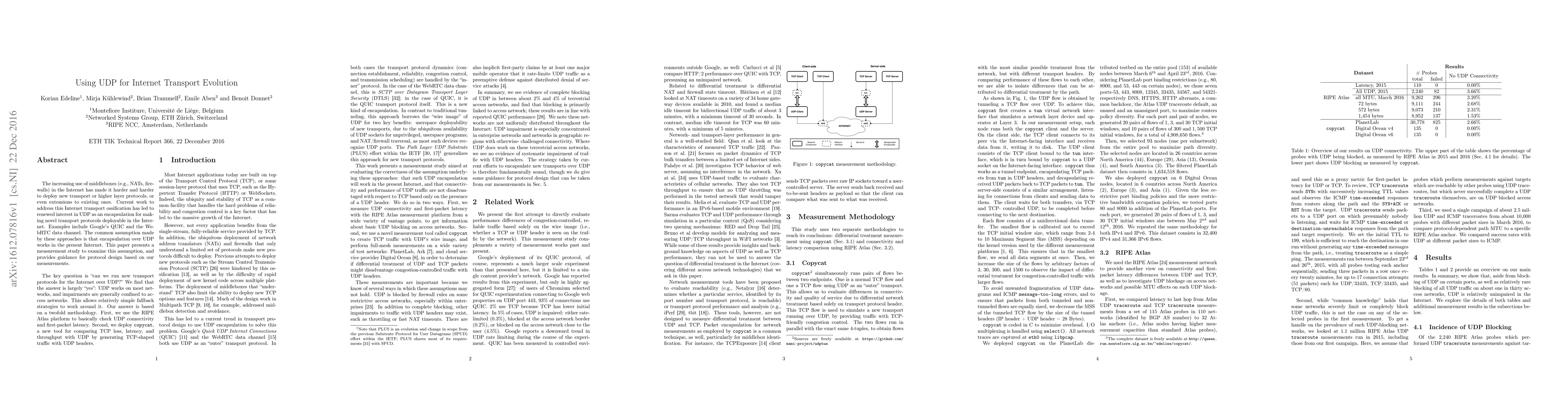 This paper investigates the viability of deploying new transport protocols over UDP in the current Internet, finding that UDP generally works well except in access networks. The study uses RIPE Atlas and a tool called copycat to measure UDP connectivity and performance, concluding that simple fallback strategies can mitigate impairments.