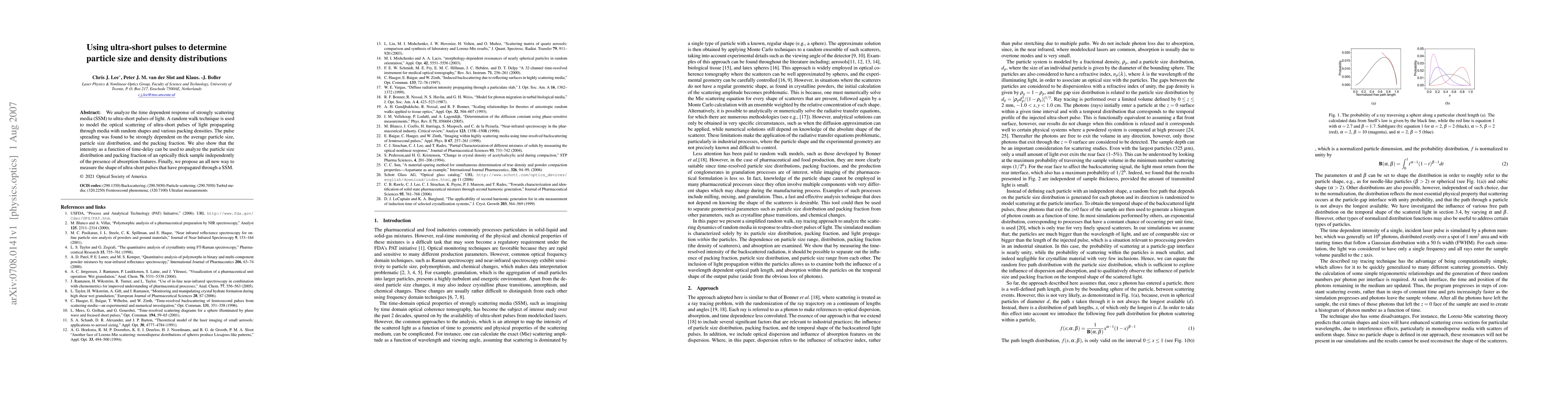 We analyze the time dependent response of strongly scattering media (SSM) to ultra-short pulses of light. A random walk technique is used to model the optical scattering of ultra-short pulses of light propagating through media with random shapes and various packing densities. The pulse spreading was found to be strongly dependent on the average particle size, particle size distribution, and the packing fraction. We also show that the intensity as a function of time-delay can be used to analyze the particle size distribution and packing fraction of an optically thick sample independently of the presence of absorption features. Finally, we propose an all new way to measure the shape of ultra-short pulses that have propagated through a SSM.