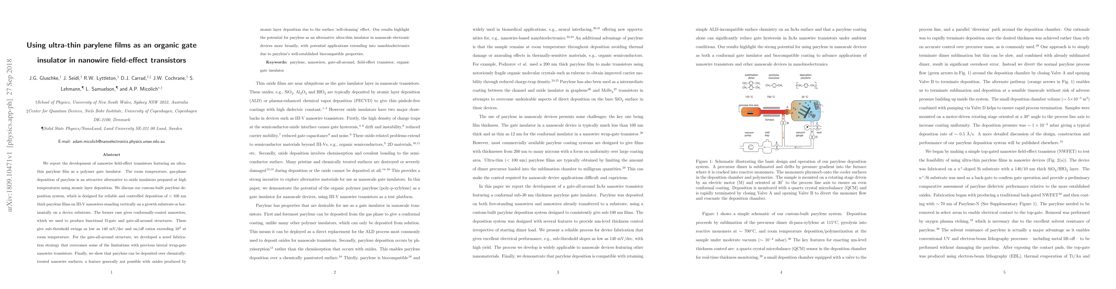 This paper develops nanowire field-effect transistors using ultra-thin parylene films as gate insulators, achieving low sub-threshold swings and high on/off ratios. The study highlights a novel gas-phase deposition method for parylene, demonstrating its potential as an alternative to high-temperature oxide insulators, with applications extending to nanobioelectronics.