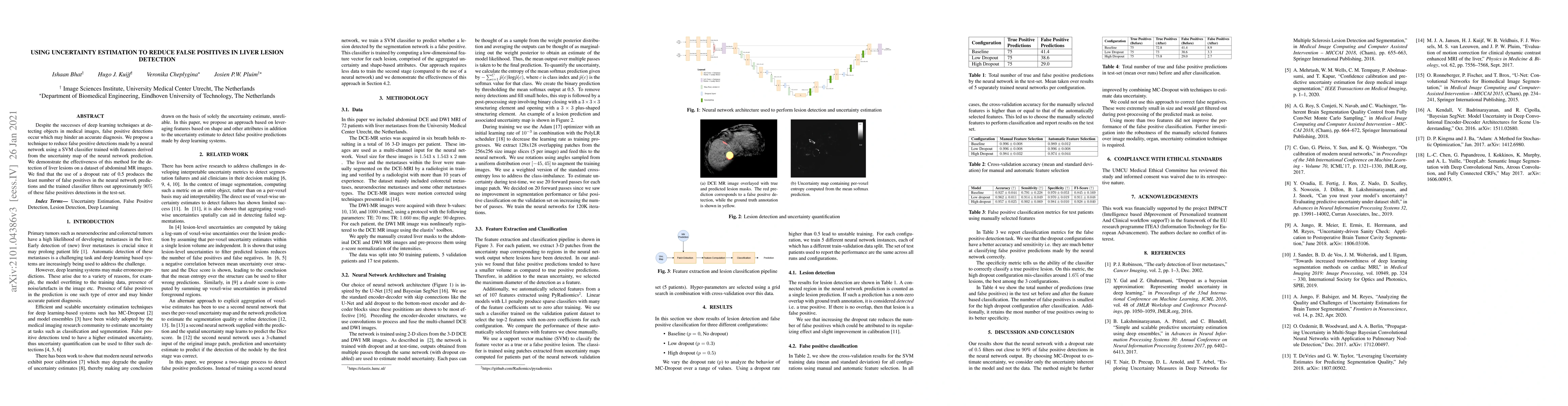This paper proposes a method to reduce false positives in liver lesion detection using an SVM classifier trained on features from the uncertainty map of neural network predictions. The technique effectively filters out approximately 90% of false positives, with a dropout rate of 0.5 yielding the best results on abdominal MR images.