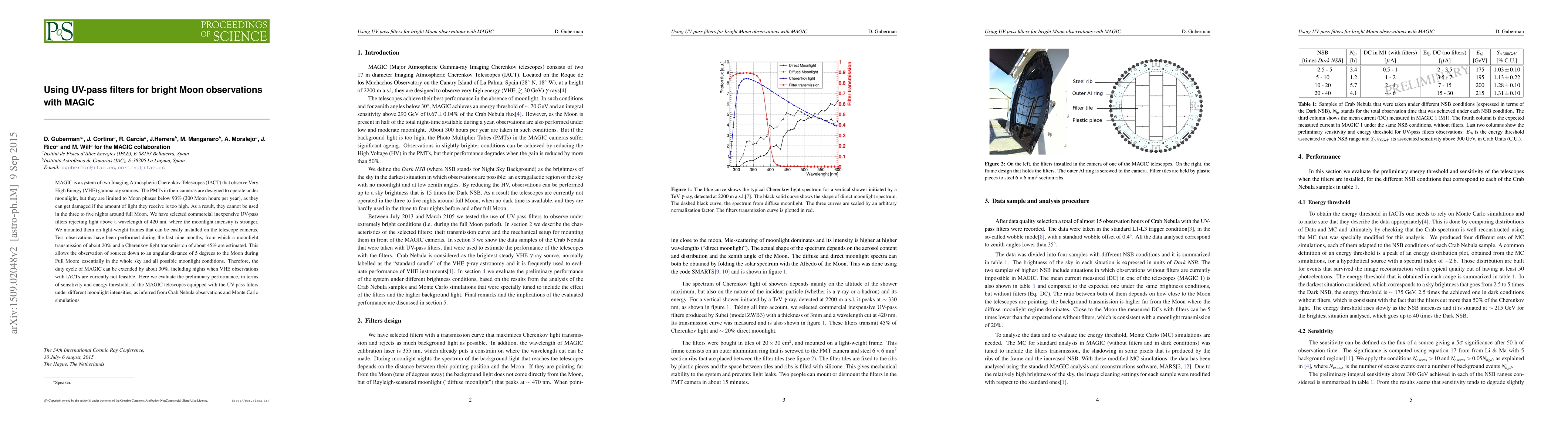 MAGIC is a system of two Imaging Atmospheric Cherenkov Telescopes (IACT) that observe Very High Energy (VHE) gamma ray sources. The PMTs in their cameras are designed to operate under moonlight, but they are limited to Moon phases below 93% (300 Moon hours per year), as they can get damaged if the amount of light they receive is too high. As a result, they cannot be used in the three to five nights around full Moon. We have selected commercial inexpensive UV-pass filters rejecting light above a wavelength of 420 nm, where the moonlight intensity is stronger. We mounted them on light-weight frames that can be easily installed on the telescope cameras. Test observations have been performed during the last nine months, from which a moonlight transmission of about 20% and a Cherenkov light transmission of about 45% are estimated. This allows the observation of sources down to an angular distance of 5 degrees to the Moon during Full Moon: essentially in the whole sky and all possible moonlight conditions. Therefore, the duty cycle of MAGIC can be extended by about 30%, including nights when VHE observations with IACTs are currently not feasible. Here we evaluate the preliminary performance, in terms of sensitivity and energy threshold, of the MAGIC telescopes equipped with the UV-pass filters under different moonlight intensities, as inferred from Crab Nebula observations and Monte Carlo simulations.