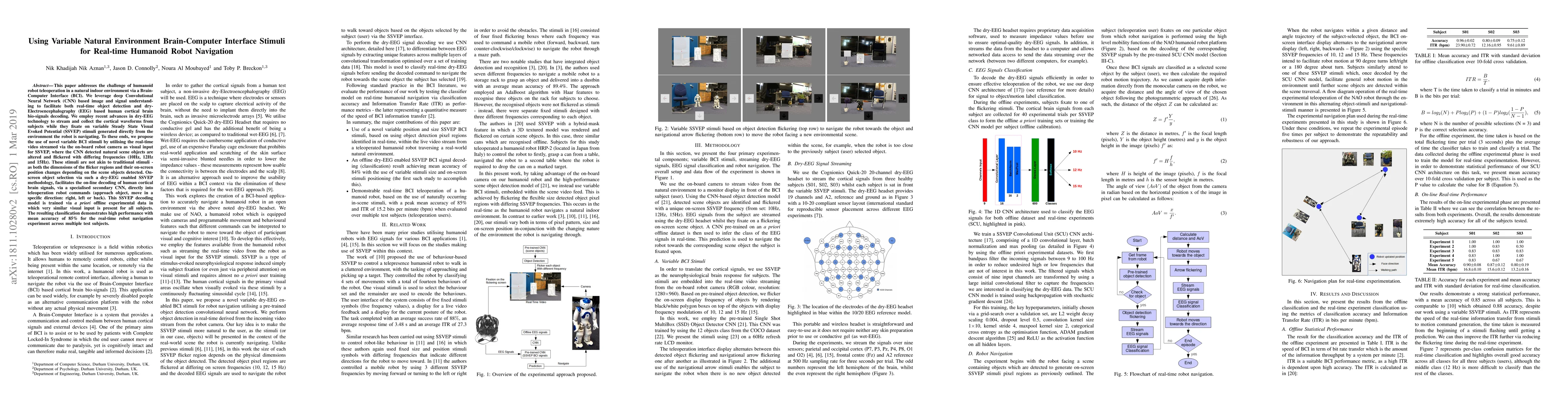 This paper proposes a novel Brain-Computer Interface (BCI) method for humanoid robot navigation using real-time visual stimuli from the robot's environment, employing deep CNNs for object detection and SSVEP decoding of EEG signals. The approach achieves a mean accuracy of 85% in real-time robot navigation commands.