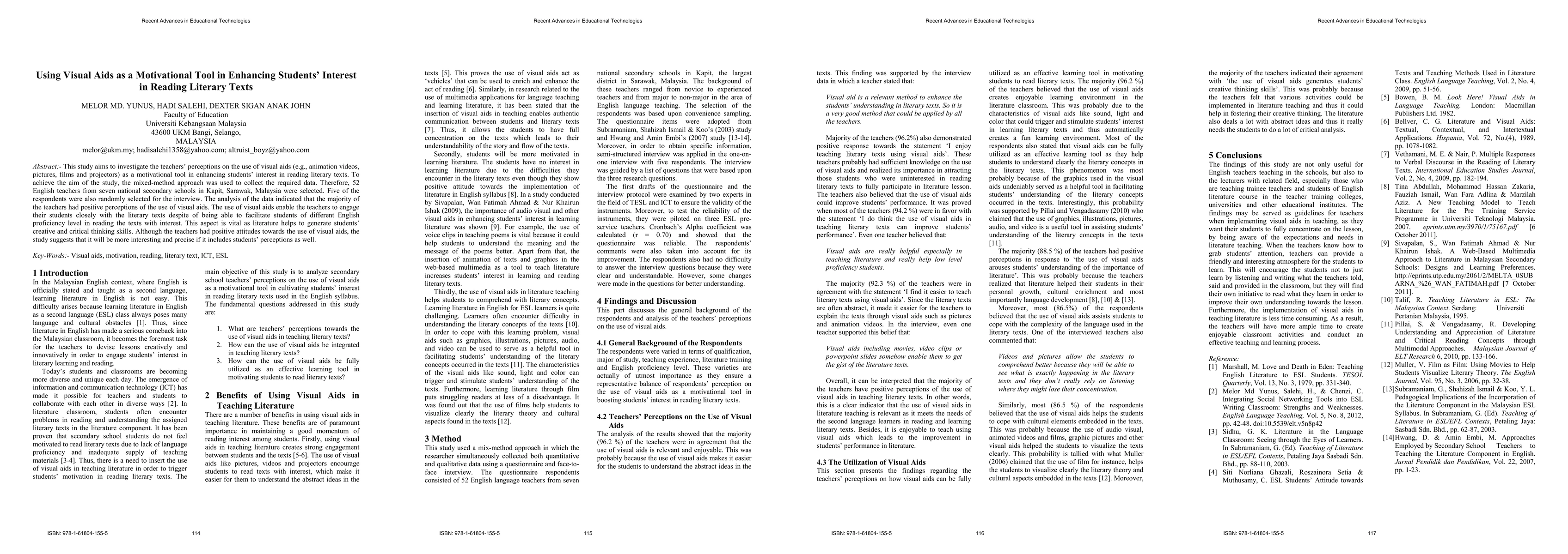 This study aims to investigate the teachers perceptions on the use of visual aids (e.g., animation videos, pictures, films and projectors) as a motivational tool in enhancing students interest in reading literary texts. To achieve the aim of the study, the mixed-method approach was used to collect the required data. Therefore, 52 English teachers from seven national secondary schools in Kapit, Sarawak, Malaysia were selected. Five of the respondents were also randomly selected for the interview. The analysis of the data indicated that the majority of the teachers had positive perceptions of the use of visual aids. The use of visual aids enable the teachers to engage their students closely with the literary texts despite of being able to facilitate students of different English proficiency level in reading the texts with interest. This aspect is vital as literature helps to generate students creative and critical thinking skills. Although the teachers had positive attitudes towards the use of visual aids, the study suggests that it will be more interesting and precise if it includes students perceptions as well.