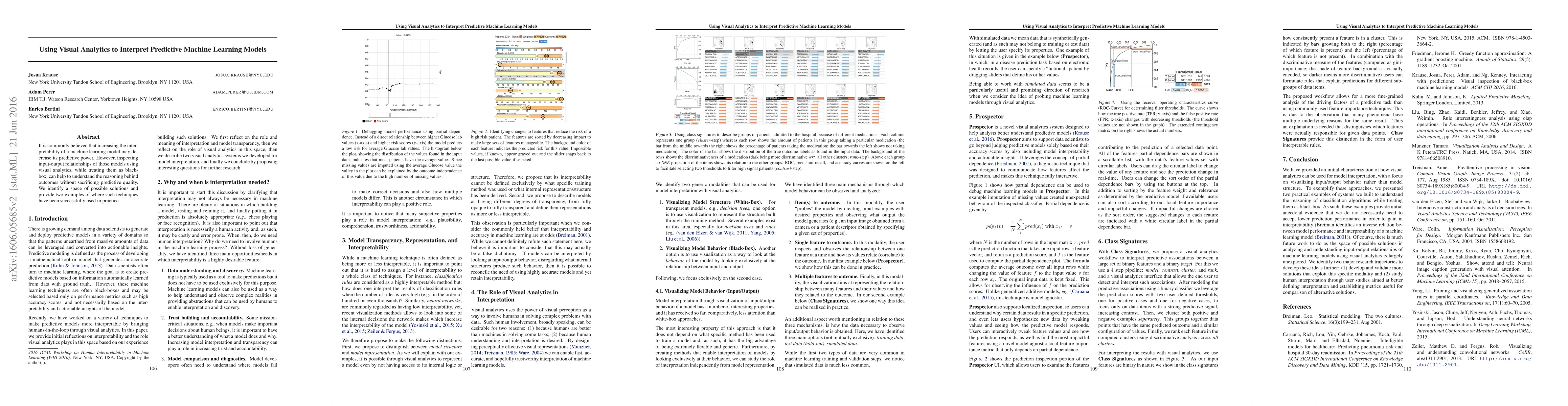 It is commonly believed that increasing the interpretability of a machine learning model may decrease its predictive power. However, inspecting input-output relationships of those models using visual analytics, while treating them as black-box, can help to understand the reasoning behind outcomes without sacrificing predictive quality. We identify a space of possible solutions and provide two examples of where such techniques have been successfully used in practice.