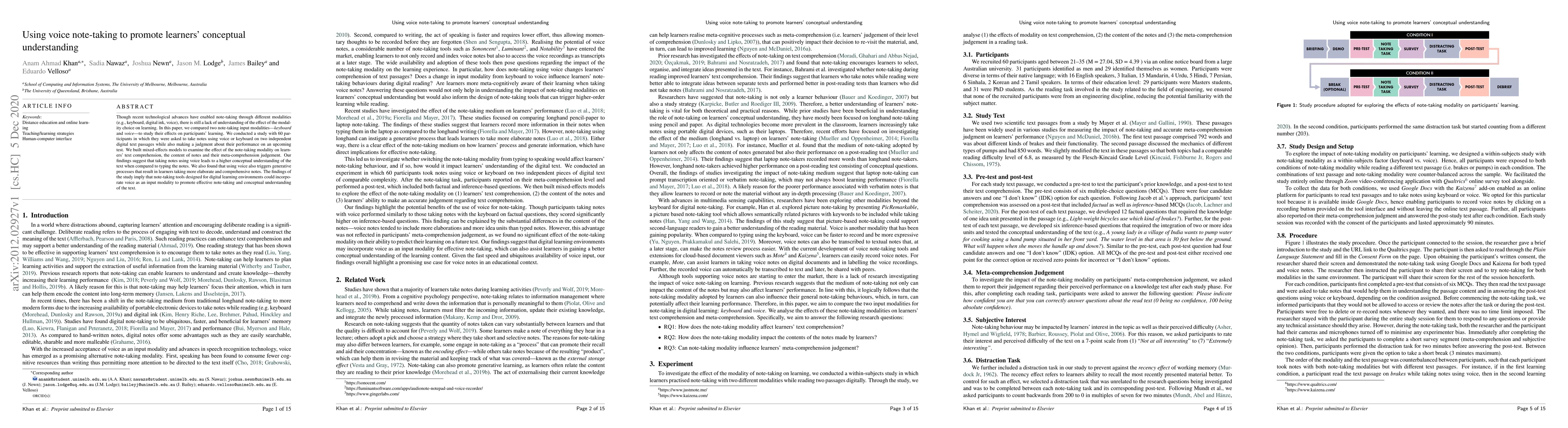 This study compares voice and keyboard note-taking modalities to assess their impact on learning outcomes. Results indicate that voice note-taking enhances conceptual understanding and leads to more elaborate notes, suggesting that digital tools should incorporate voice input for better learning.