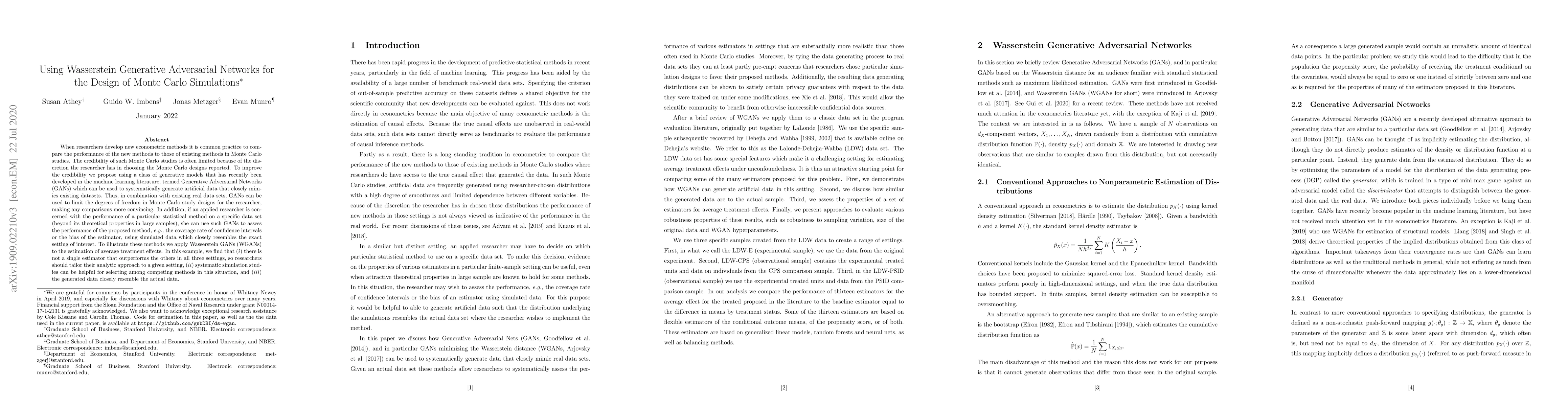 When researchers develop new econometric methods it is common practice to compare the performance of the new methods to those of existing methods in Monte Carlo studies. The credibility of such Monte Carlo studies is often limited because of the freedom the researcher has in choosing the design. In recent years a new class of generative models emerged in the machine learning literature, termed Generative Adversarial Networks (GANs) that can be used to systematically generate artificial data that closely mimics real economic datasets, while limiting the degrees of freedom for the researcher and optionally satisfying privacy guarantees with respect to their training data. In addition if an applied researcher is concerned with the performance of a particular statistical method on a specific data set (beyond its theoretical properties in large samples), she may wish to assess the performance, e.g., the coverage rate of confidence intervals or the bias of the estimator, using simulated data which resembles her setting. Tol illustrate these methods we apply Wasserstein GANs (WGANs) to compare a number of different estimators for average treatment effects under unconfoundedness in three distinct settings (corresponding to three real data sets) and present a methodology for assessing the robustness of the results. In this example, we find that (i) there is not one estimator that outperforms the others in all three settings, so researchers should tailor their analytic approach to a given setting, and (ii) systematic simulation studies can be helpful for selecting among competing methods in this situation.