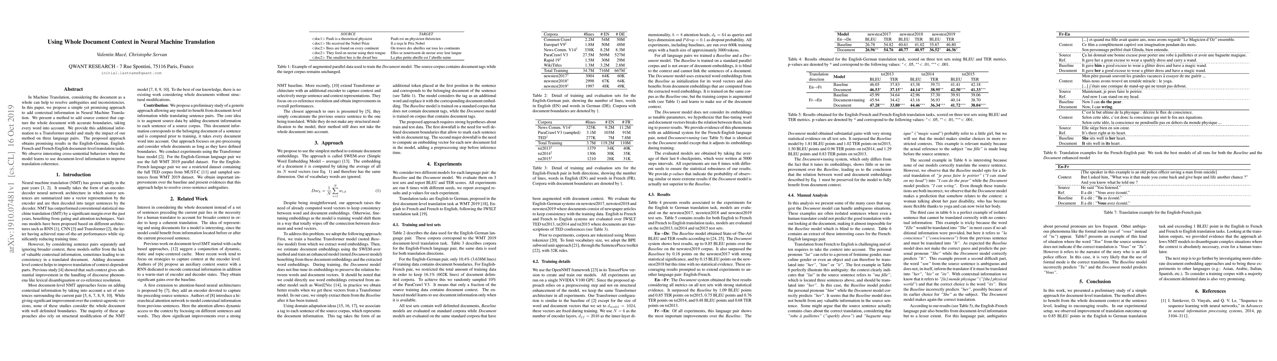 This paper proposes a method to incorporate whole document context into Neural Machine Translation using a Transformer model, achieving improved translation coherence and resolving ambiguities across sentences in English-German, English-French, and French-English translations. The approach shows promising results by utilizing contextual information that accurately captures document boundaries.