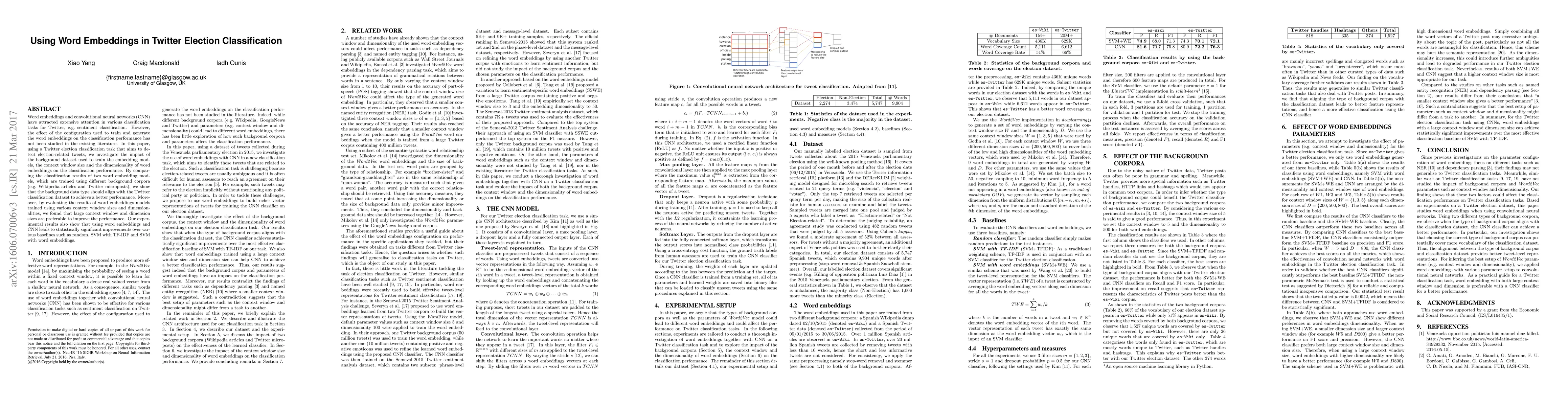 This paper investigates how different configurations for training word embeddings affect the classification of election-related tweets on Twitter. It finds that embeddings trained on datasets similar to Twitter data yield better classification performance, and larger context windows and higher dimensions further enhance results, leading to significant improvements over traditional baselines.