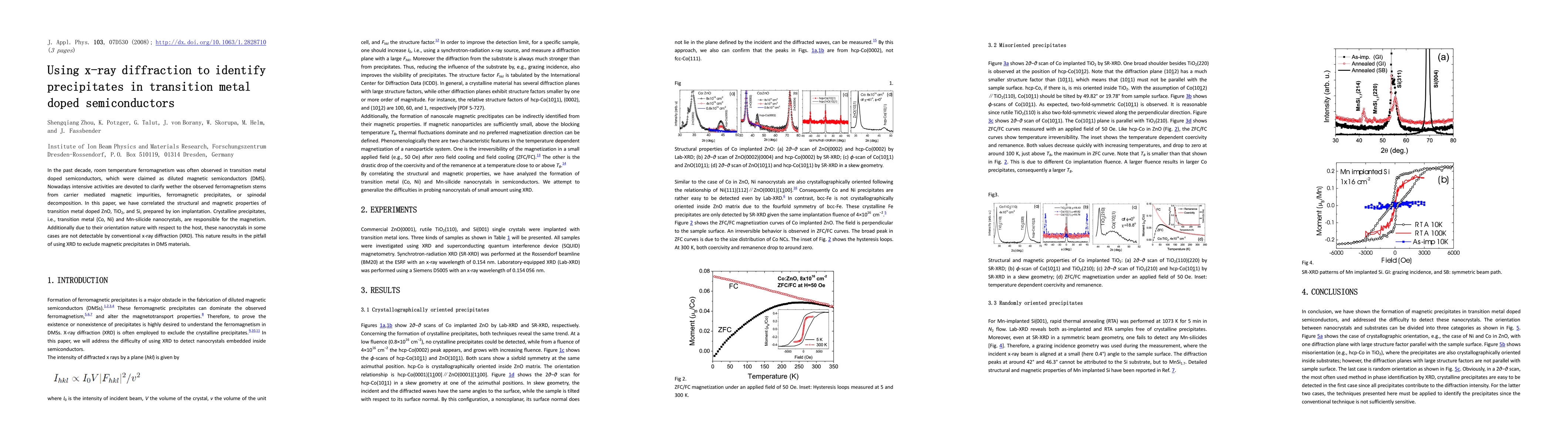 In the past decade, room temperature ferromagnetism was often observed in transition metal doped semiconductors, which were claimed as diluted magnetic semiconductors (DMS). Nowadays intensive activities are devoted to clarify wether the observed ferromagnetism stems from carrier mediated magnetic impurities, ferromagnetic precipitates, or spinodal decomposition. In this paper, we have correlated the structural and magnetic properties of transition metal doped ZnO, TiO2, and Si, prepared by ion implantation. Crystalline precipitates, i.e., transition metal (Co, Ni) and Mn-silicide nanocrystals, are responsible for the magnetism. Additionally due to their orientation nature with respect to the host, these nanocrystals in some cases are not detectable by conventional x-ray diffraction (XRD). This nature results in the pitfall of using XRD to exclude magnetic precipitates in DMS materials.