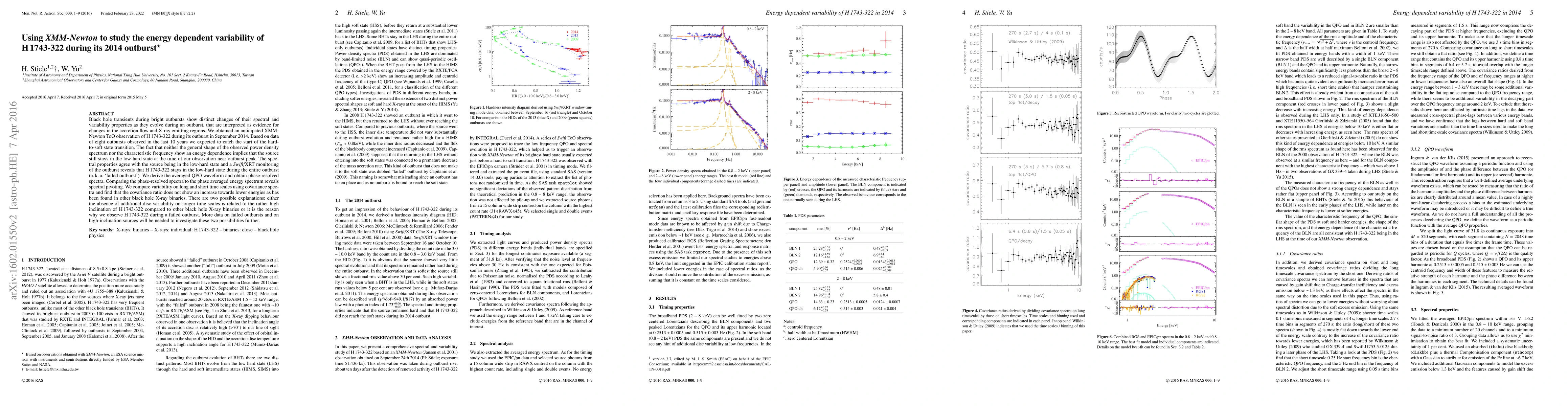 Black hole transients during bright outbursts show distinct changes of their spectral and variability properties as they evolve during an outburst, that are interpreted as evidence for changes in the accretion flow and X-ray emitting regions. We obtained an anticipated XMM-Newton ToO observation of H 1743-322 during its outburst in September 2014. Based on data of eight outbursts observed in the last 10 years we expected to catch the start of the hard-to-soft state transition. The fact that neither the general shape of the observed power density spectrum nor the characteristic frequency show an energy dependence implies that the source still stays in the low-hard state at the time of our observation near outburst peak. The spectral properties agree with the source being in the low-hard state and a Swift/XRT monitoring of the outburst reveals that H 1743-322 stays in the low-hard state during the entire outburst (a. k. a. 'failed outburst'). We derive the averaged QPO waveform and obtain phase-resolved spectra. Comparing the phase-resolved spectra to the phase averaged energy spectrum reveals spectral pivoting. We compare variability on long and short time scales using covariance spectra and find that the covariance ratio does not show an increase towards lower energies as has been found in other black hole X-ray binaries. There are two possible explanations: either the absence of additional disc variability on longer time scales is related to the rather high inclination of H 1743-322 compared to other black hole X-ray binaries or it is the reason why we observe H 1743-322 during a failed outburst. More data on failed outbursts and on high-inclination sources will be needed to investigate these two possibilities further.