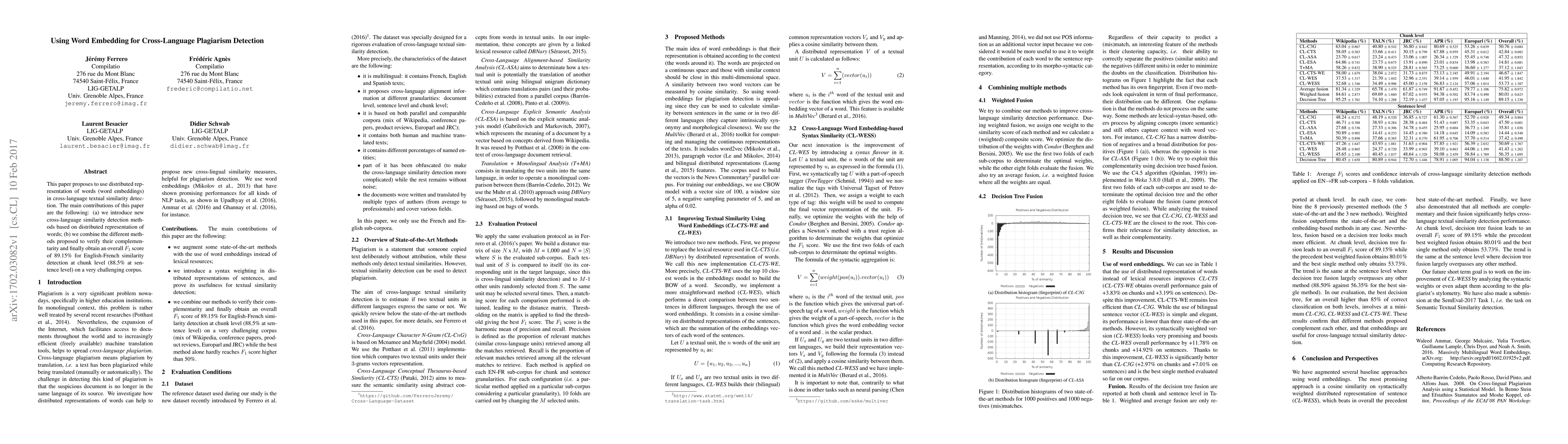 This paper proposes new methods for cross-language textual similarity detection using word embeddings, achieving an F1 score of 89.15% for English-French comparisons at the chunk level, demonstrating the effectiveness of distributed word representations in detecting plagiarism across languages.