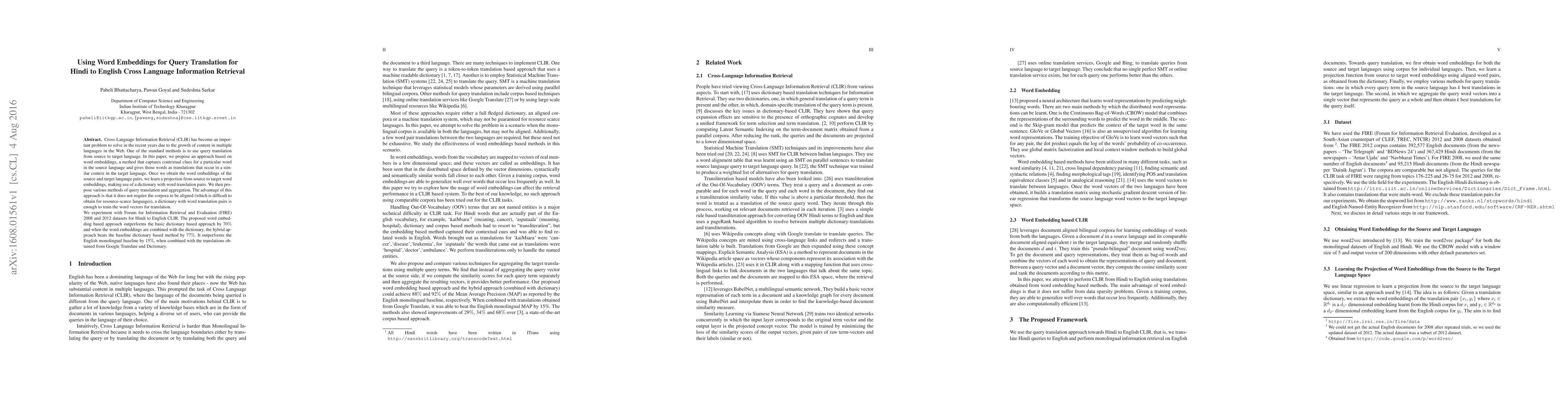 Cross-Language Information Retrieval (CLIR) has become an important problem to solve in the recent years due to the growth of content in multiple languages in the Web. One of the standard methods is to use query translation from source to target language. In this paper, we propose an approach based on word embeddings, a method that captures contextual clues for a particular word in the source language and gives those words as translations that occur in a similar context in the target language. Once we obtain the word embeddings of the source and target language pairs, we learn a projection from source to target word embeddings, making use of a dictionary with word translation pairs.We then propose various methods of query translation and aggregation. The advantage of this approach is that it does not require the corpora to be aligned (which is difficult to obtain for resource-scarce languages), a dictionary with word translation pairs is enough to train the word vectors for translation. We experiment with Forum for Information Retrieval and Evaluation (FIRE) 2008 and 2012 datasets for Hindi to English CLIR. The proposed word embedding based approach outperforms the basic dictionary based approach by 70% and when the word embeddings are combined with the dictionary, the hybrid approach beats the baseline dictionary based method by 77%. It outperforms the English monolingual baseline by 15%, when combined with the translations obtained from Google Translate and Dictionary.
