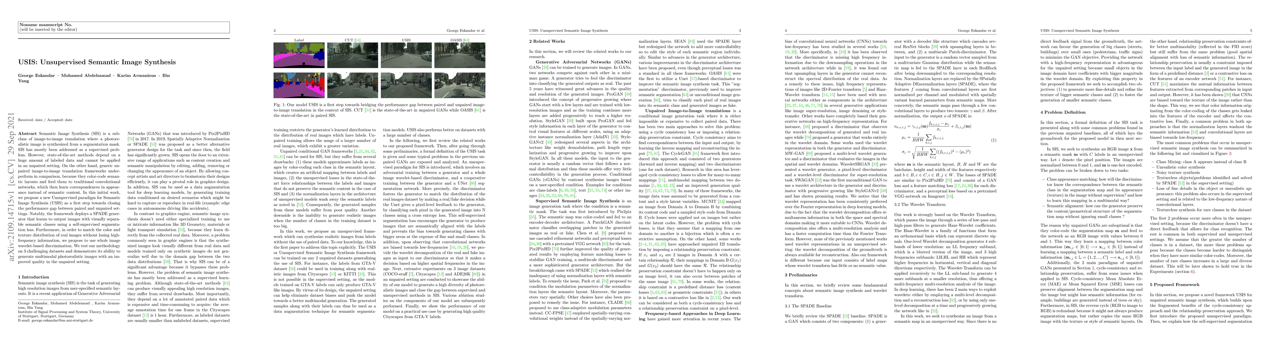 Semantic Image Synthesis (SIS) is a subclass of image-to-image translation where a photorealistic image is synthesized from a segmentation mask. SIS has mostly been addressed as a supervised problem. However, state-of-the-art methods depend on a huge amount of labeled data and cannot be applied in an unpaired setting. On the other hand, generic unpaired image-to-image translation frameworks underperform in comparison, because they color-code semantic layouts and feed them to traditional convolutional networks, which then learn correspondences in appearance instead of semantic content. In this initial work, we propose a new Unsupervised paradigm for Semantic Image Synthesis (USIS) as a first step towards closing the performance gap between paired and unpaired settings. Notably, the framework deploys a SPADE generator that learns to output images with visually separable semantic classes using a self-supervised segmentation loss. Furthermore, in order to match the color and texture distribution of real images without losing high-frequency information, we propose to use whole image wavelet-based discrimination. We test our methodology on 3 challenging datasets and demonstrate its ability to generate multimodal photorealistic images with an improved quality in the unpaired setting.